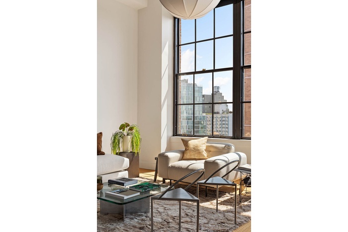 Upon entry, a gracious foyer sets the tone, before opening into a spectacular great room of dramatic scale. Here, newly restored 10-foot factory double hung windows frame the expansive, open-concept living and dining area, offering a stunning panorama of natural light and sweeping city views.