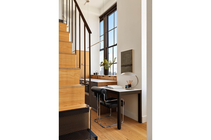 Storage and versatility are woven throughout the heart of its design. An efficient home office nook is cleverly tucked between the kitchen and secondary bedroom, while additional closets are hidden within the staircase that leads to the windowed lofted mezzanine, a flexible space ideal for an office, playroom, art studio, library, den, or guest sleeping area.