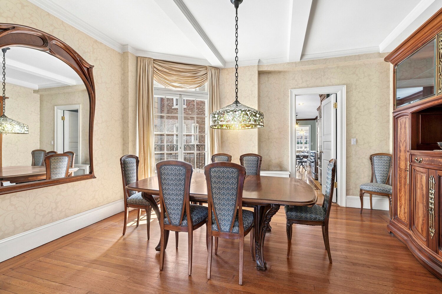 Pocket doors connect to the formal dining room, which can accommodate a twelve-seat table and opens to a second Juliette balcony. The adjacent chef's kitchen extends over 30 feet, with cherrywood cabinetry, Fulper tile and custom hardwood floors, Subzero, Miele, and Thermador appliances, a walk-in pantry, and a custom cherrywood banquette breakfast nook. Beyond lies a spacious den/media room with custom millwork, grasscloth wallcovering, ample closets, and a secondary entrance.