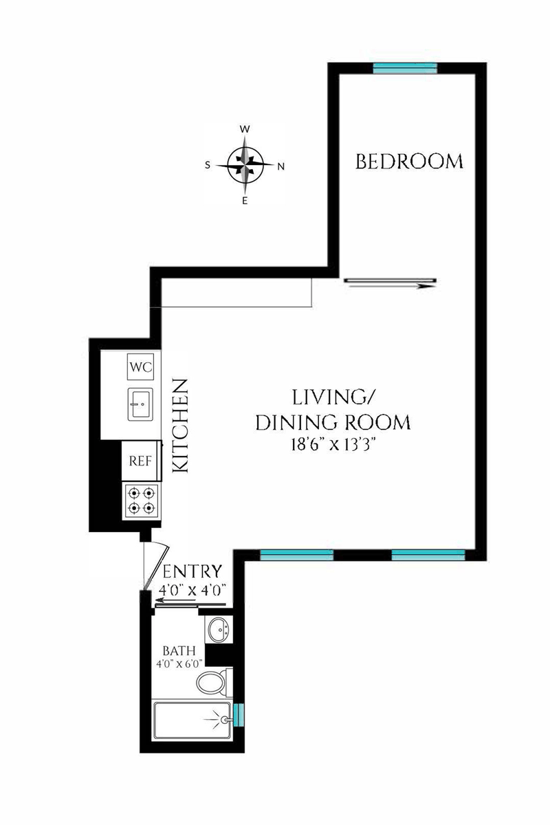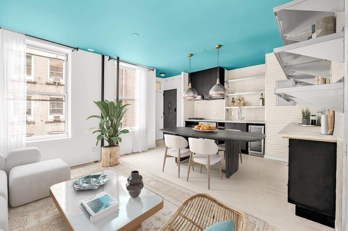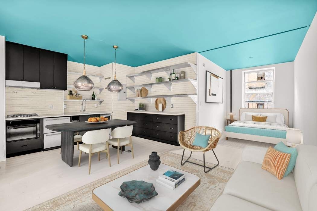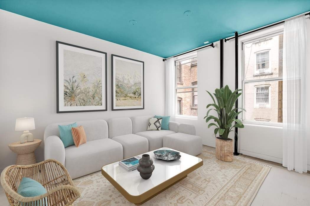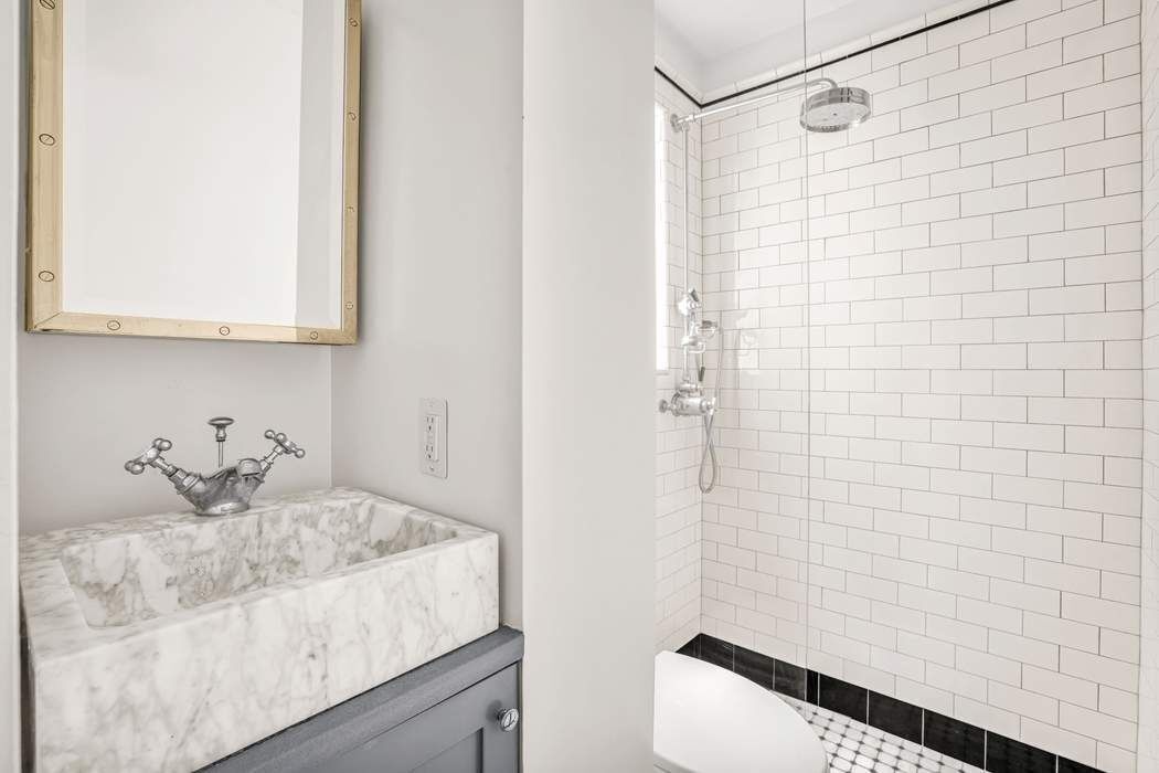 Apartment number 19 is a one-bedroom home boasting double exposures and a well outfitted chef’s kitchen. The space has been renovated with custom tile and modern stainless shelving throughout. The living room has two large windows that face east and get a great morning light. 9-Foot ceilings flash a modern pop of color that is welcome in this beautifully designed apartment.. A stainless Summit refrigerator/freezer along with a wine cooler provides ample cold storage, and a custom wall of drawers provides a gracious amount of kitchen storage. The kitchen also has a garbage disposal and water filtration system built into the sink. The windowed bathroom boasts a custom vanity with a marble sink, and is wrapped in fresh subway tiling. The bathroom holds a well appointed standing shower, with polished fixtures by Lefroy Brooks. Separated by a sturdy sliding door, the bedroom has a west facing window that offers wonderful afternoon light. The bedroom is large enough to hold a queen sized bed with nightstand and provides a peaceful, quiet retreat in the heart of SoHo.