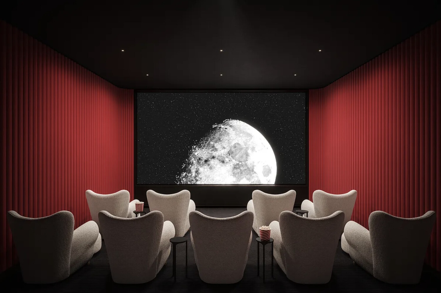 The building's landscaped porte-cochère opens onto a welcoming, 24-hour attended lobby where residents enjoy access to a full suite of amenities, including co-working lounges with private phone booths and a wet bar, a custom library, children's playroom, pet grooming, and a private cinema. The hospitality-driven amenities are designed by Ward & Gray.
