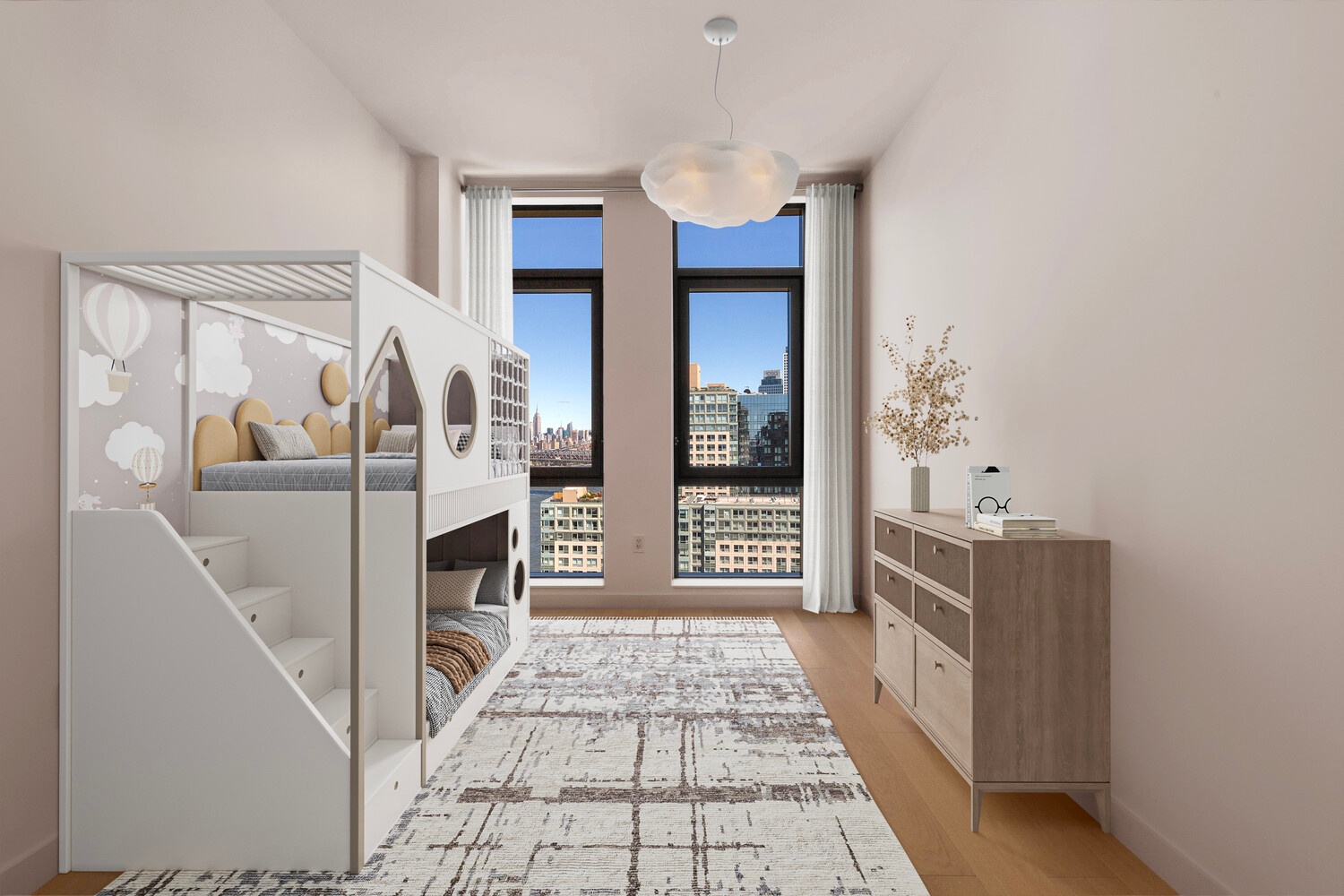 Perched at the top of One Williamsburg Wharf, this impeccably designed penthouse showcases breathtaking views of the East River and the Manhattan skyline.