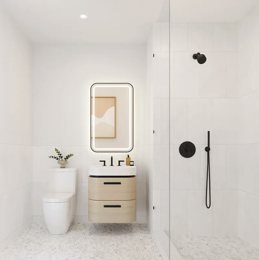 The king-size primary suite is a true retreat with dual walk-in closets and a spa-inspired en-suite bath. The bathroom features radiant heated Carrara marble mosaic floors, fluted Dolomite wainscoting, a custom double vanity, an oversized LED-lit medicine cabinet, a walk-in shower with a built-in niche and a full-height storage unit with an integrated hamper.
