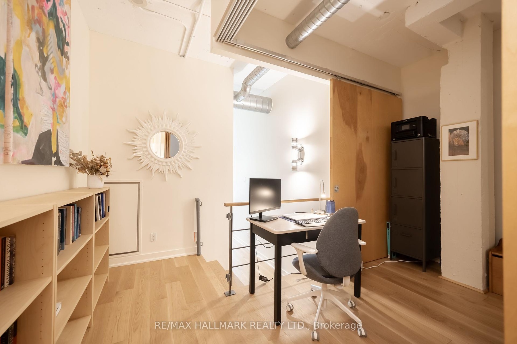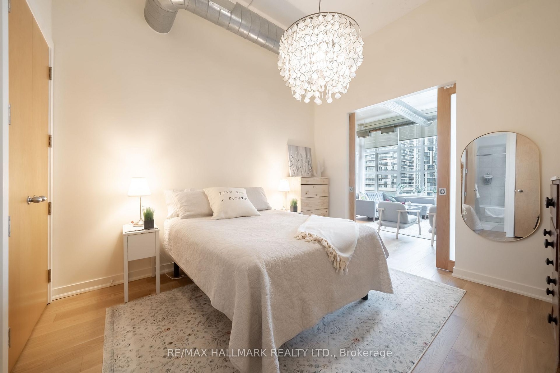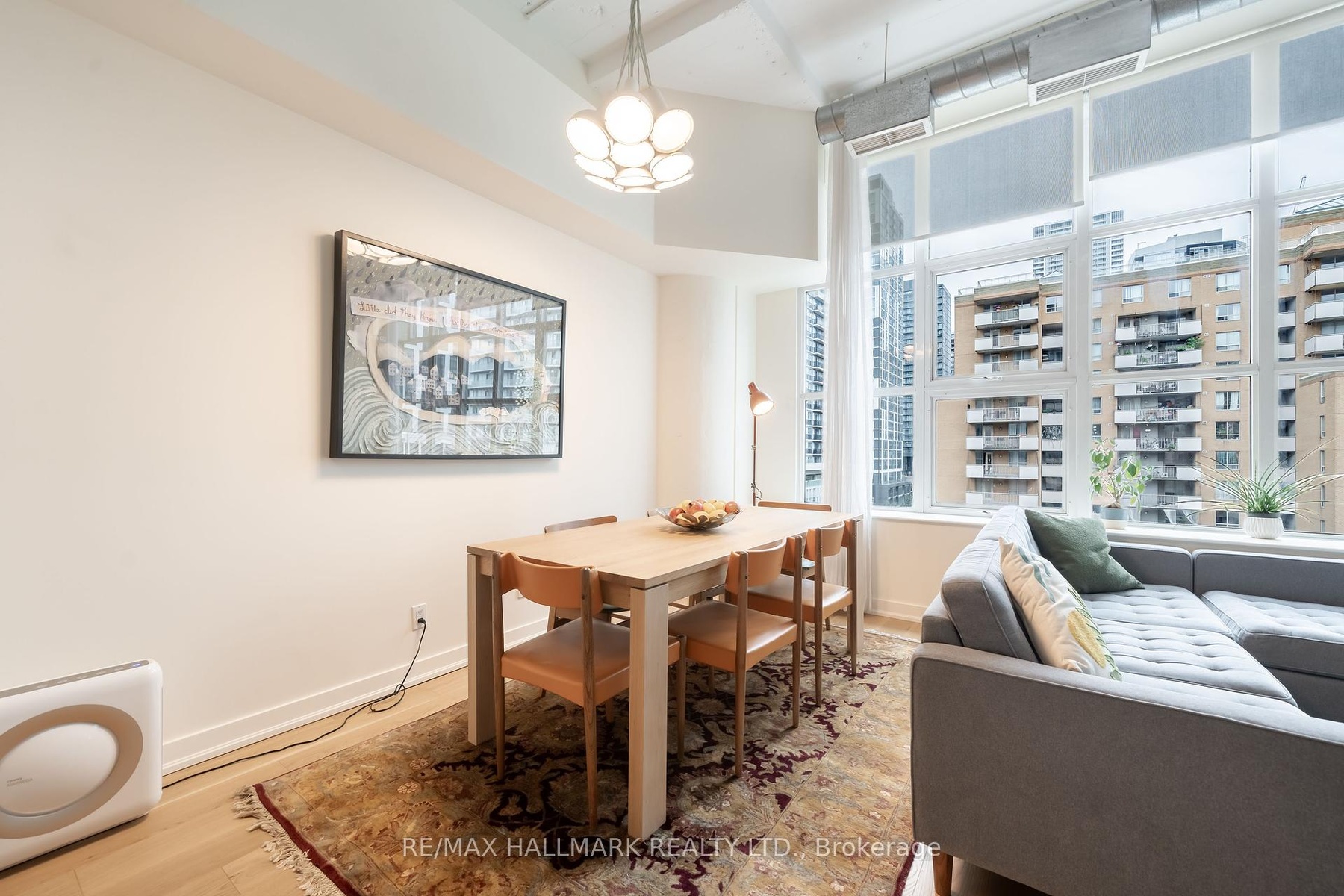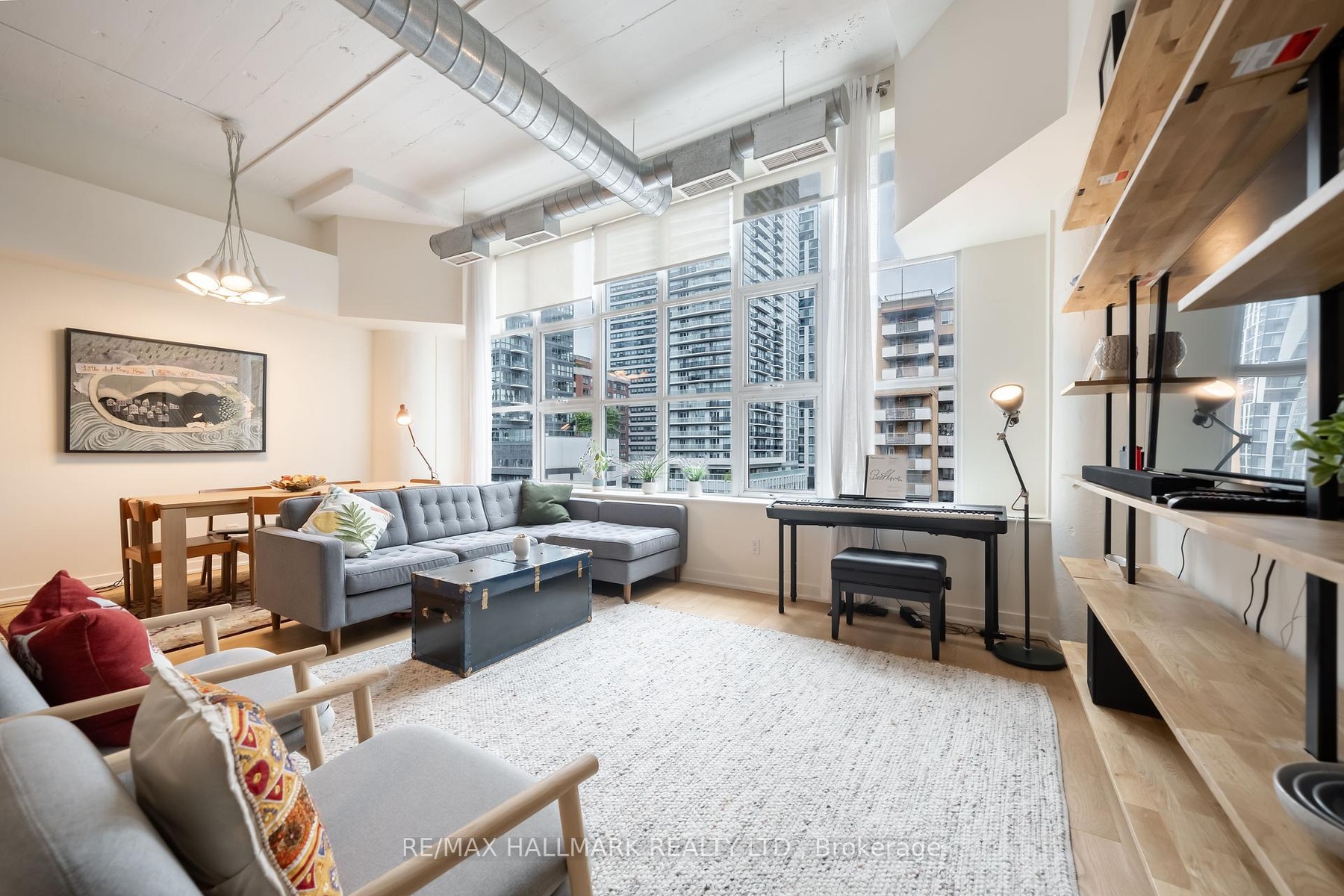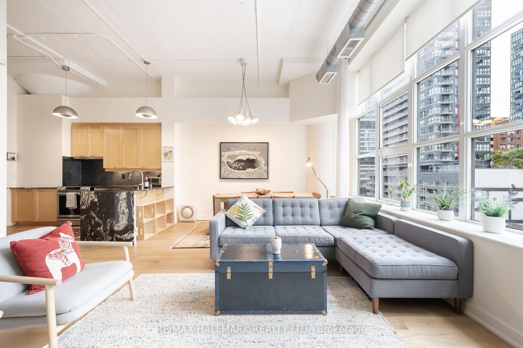 Live in Iconic Merchandise Lofts! Experience the best of downtown living in this South-facing spacious 2+Den with over 1,200 sq ft of living space, featuring soaring 12 ft ceilings and expansive windows that flood the space with natural light. Open concept chefs kitchen with beautiful granite waterfall countertops, and stainless steel appliances - perfect for entertaining or everyday living. Functional layout with primary bedroom featuring ensuite bath & storage, second bedroom plus versatile den/workspace. Includes parking & locker. Step outside and unwind on the incredible rooftop oasis offering gardens, BBQs, sunbathing areas, dog walk space, and an indoor pool - ideal for relaxing or hosting friends. Amenities include a fully equipped gym, yoga room, sauna, library, and games room. Enjoy unmatched convenience with a Walk Score of 100. Metro Supermarket and Page One Café right in the building. Just a 5-minute walk to Eaton Centre, Dundas Square, Toronto Metropolitan University, TTC and endless dining along Yonge Street.This is your chance to own a piece of Toronto history in one of its most sought-after loft conversions!