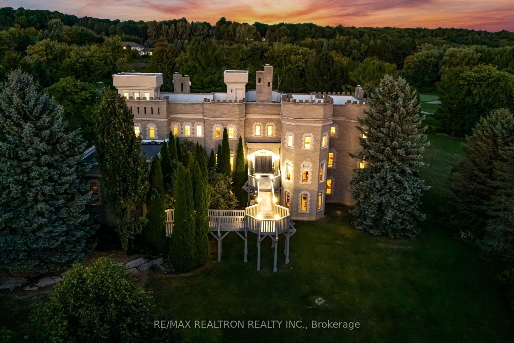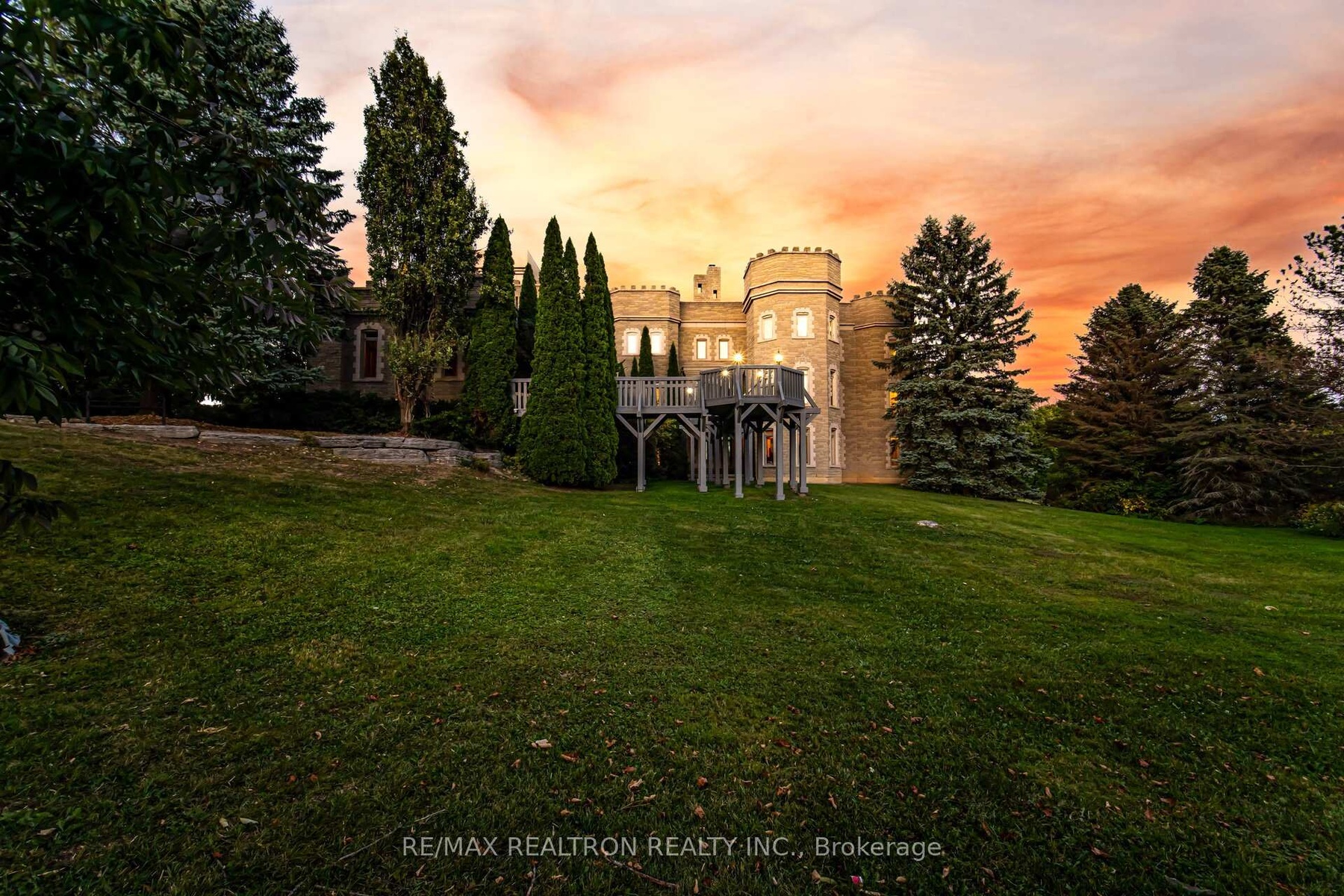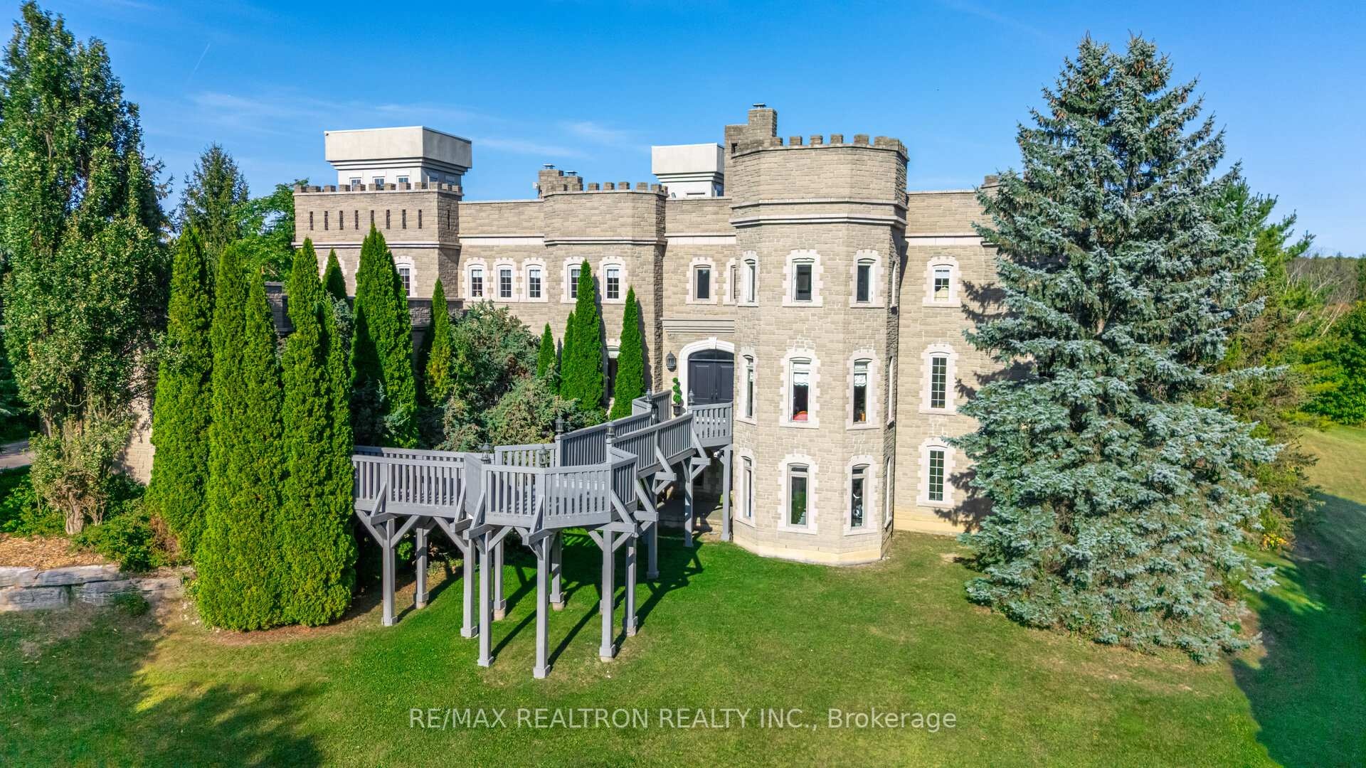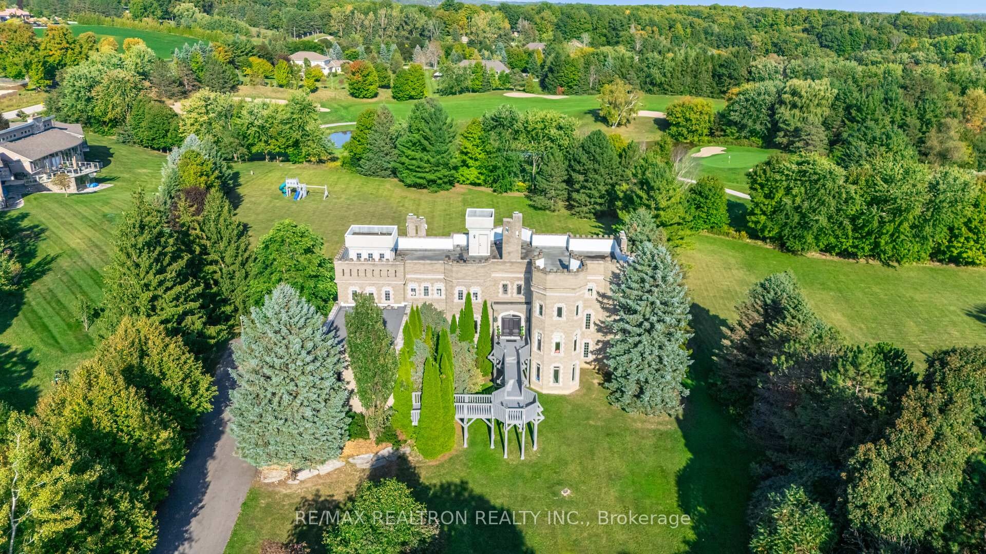 A Castle on the Golf Course - First time ever offered for sale, over 8000 sq ft finished area plus another 2600 sq ft that can be completed . This one-of-a-kind residence is a true architectural treasure. Originally showcased by the Canadian Cancer Society Designer Showcase, this remarkable estate is set on 2 private acres backing directly onto the golf course. Privately tucked back from the road, guests are welcomed onto a grand front deck that sets the stage for the elegance within. The impressive foyer is anchored by a two-storey stone fireplace, enhancing the homes sense of grandeur and warmth. The living room offers a sophisticated yet inviting space for both relaxing and entertaining. The formal dining room features a dramatic two-way fireplace, soaring ceilings, and detailed crown mouldings, creating the perfect backdrop for memorable gatherings. A private home office adds character with aged walls and a hand-painted mural. At the heart of the home, a neo-classical kitchen blends timeless design with function, opening to a versatile family room with its own fireplace and two walkouts to the expansive deck overlooking the golf course. Upstairs, the master suite is a serene retreat, featuring a walk-in closet and a spa-like 6-piece ensuite. Three additional bedrooms each enjoy their own ensuite baths, including one extraordinary train room set a whimsical escape for hobbyists of any age. The lower level extends the living space with a finished basement, offering a games room, recreation area, and a unique sub-basement, providing endless possibilities for entertaining or relaxation.