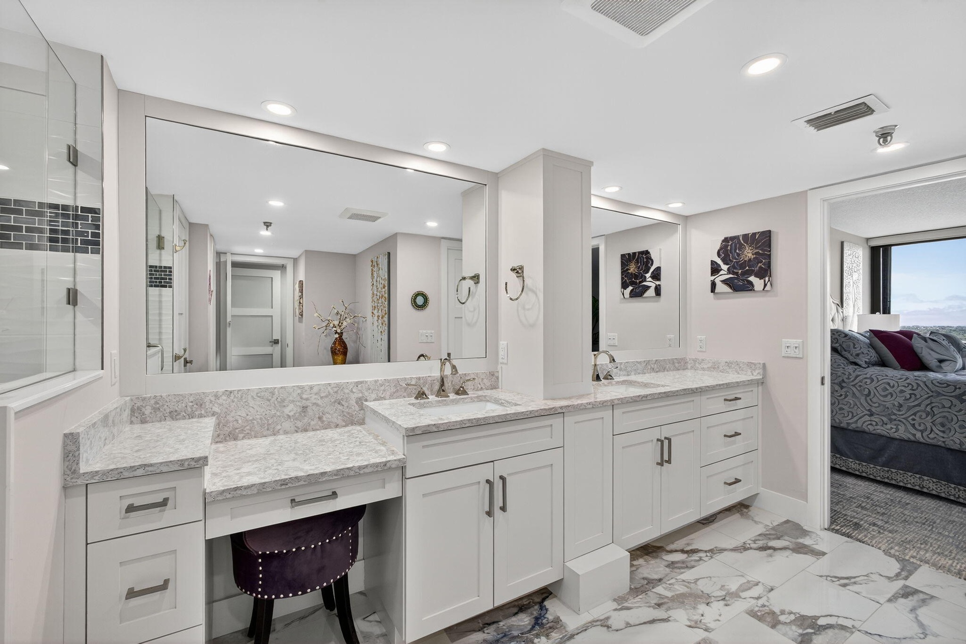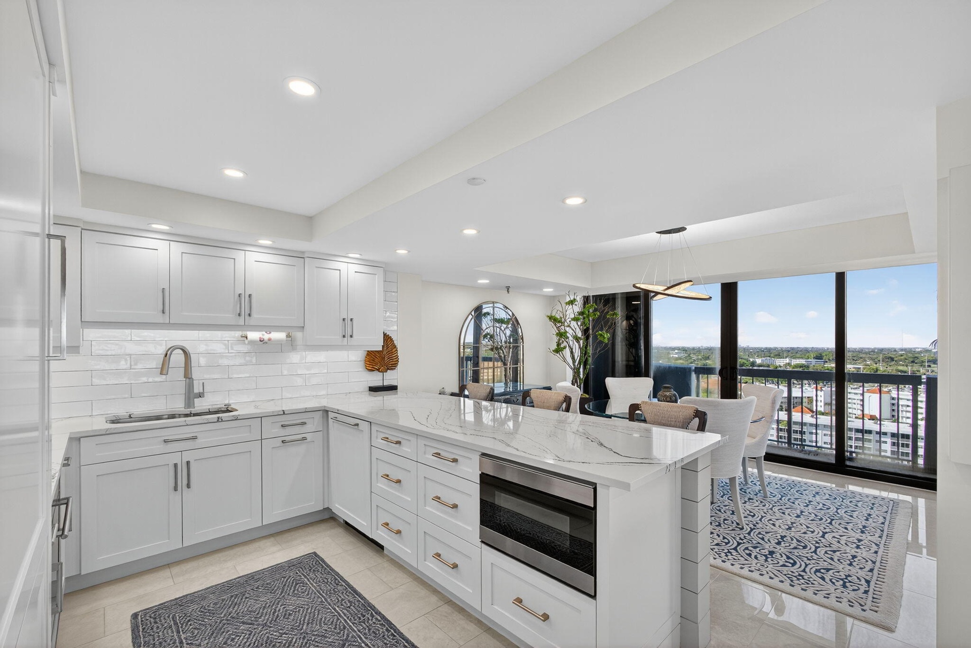 Breathtaking corner residence with 2,500+ sq. ft. and sweeping Intracoastal and Ocean views from every room. This 3BR home has been completely reimagined with elegant porcelain tile, and a showpiece chef's kitchen featuring quartz countertops, custom cabinetry, and Sub-Zero, Wolf & Miele appliances. Designer bathrooms showcase stunning tile and premium fixtures. Enjoy peace of mind with newer AC, hurricane impact glass, new accordion shutters and all new electrical. Located in the prestigious, gated Old Port Cove community in North Palm Beach, residents enjoy a resort lifestyle with a renowned marina, two-mile waterfront walking path, 24-hr security, and on site restaurant, pool, spa and his and her sauna!