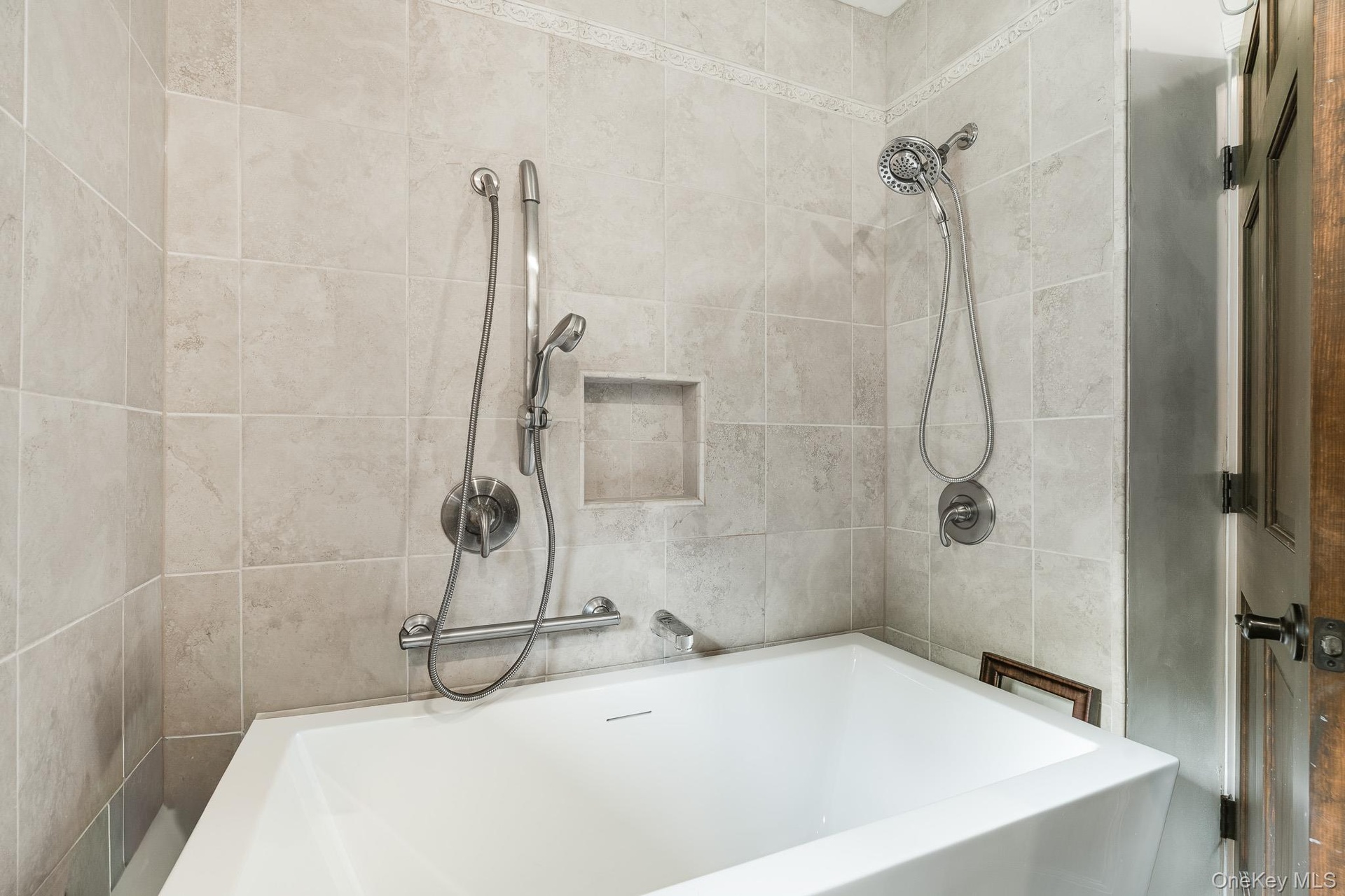 - Full bathroom featuring tile walls, a shower stall, stacked washing machine and dryer, and tile patterned flooring