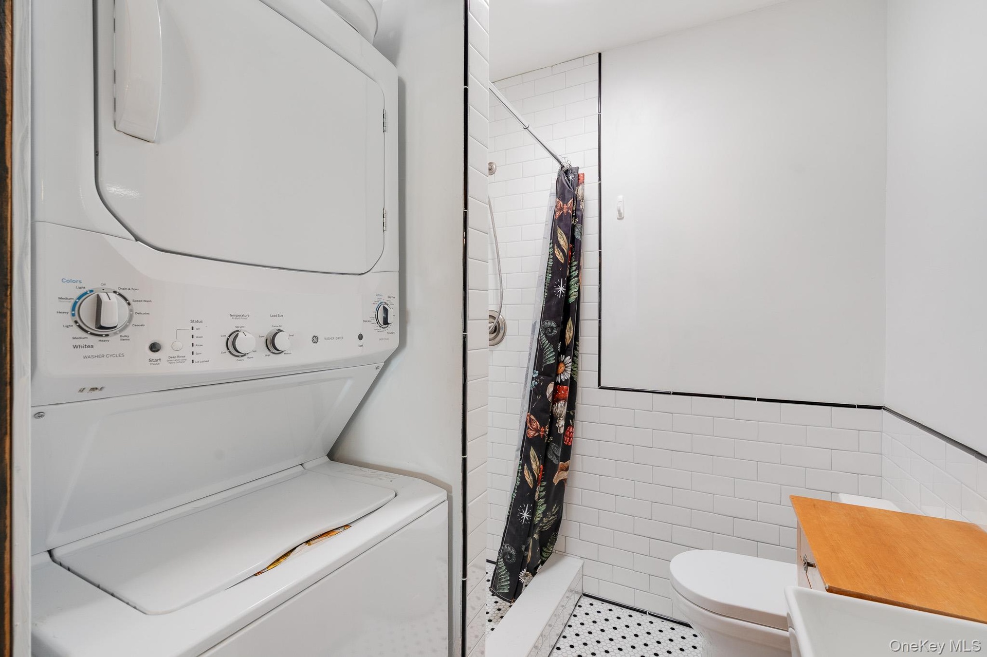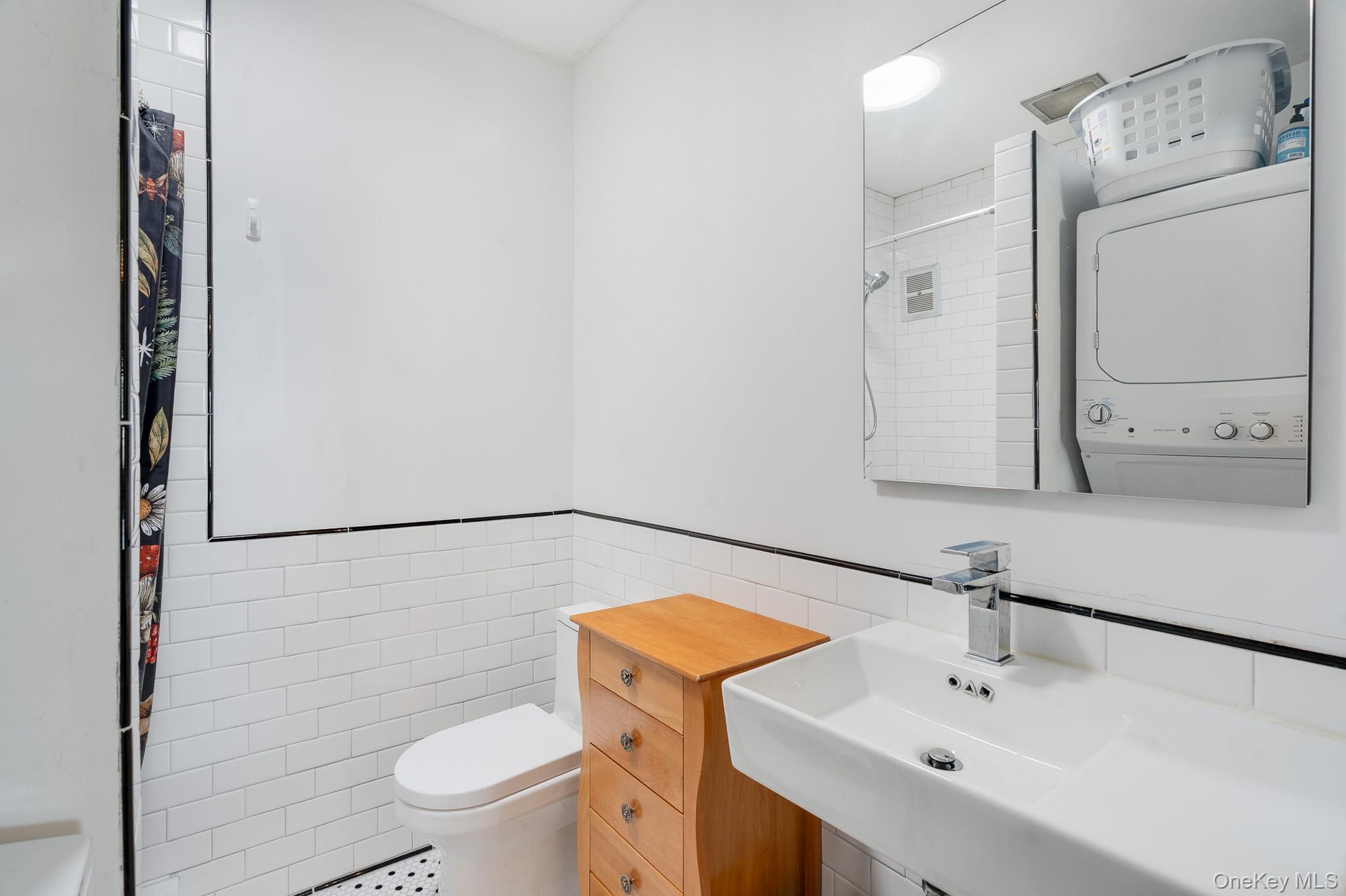 - Bathroom with tile walls, a wainscoted wall, and stacked washing machine and dryer