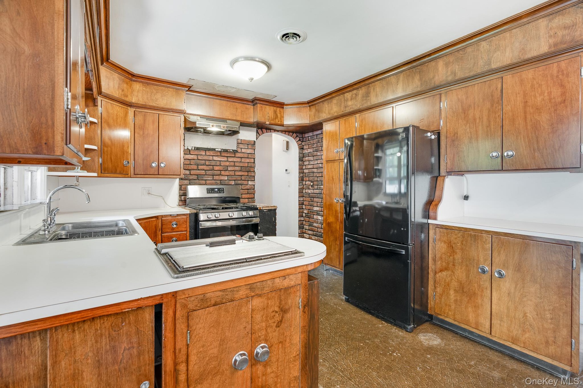 - Kitchen with light countertops, freestanding refrigerator, brown cabinetry, stainless steel gas stove, and a peninsula
