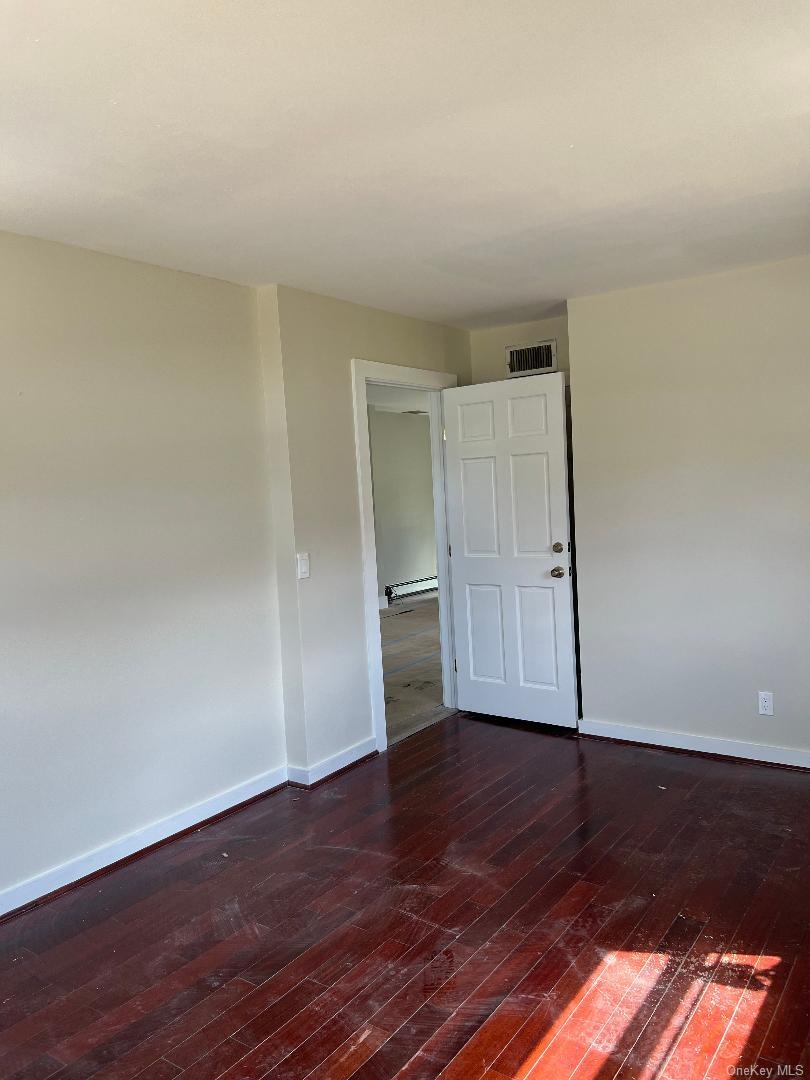 - Unfurnished bedroom featuring dark wood-type flooring and a baseboard radiator