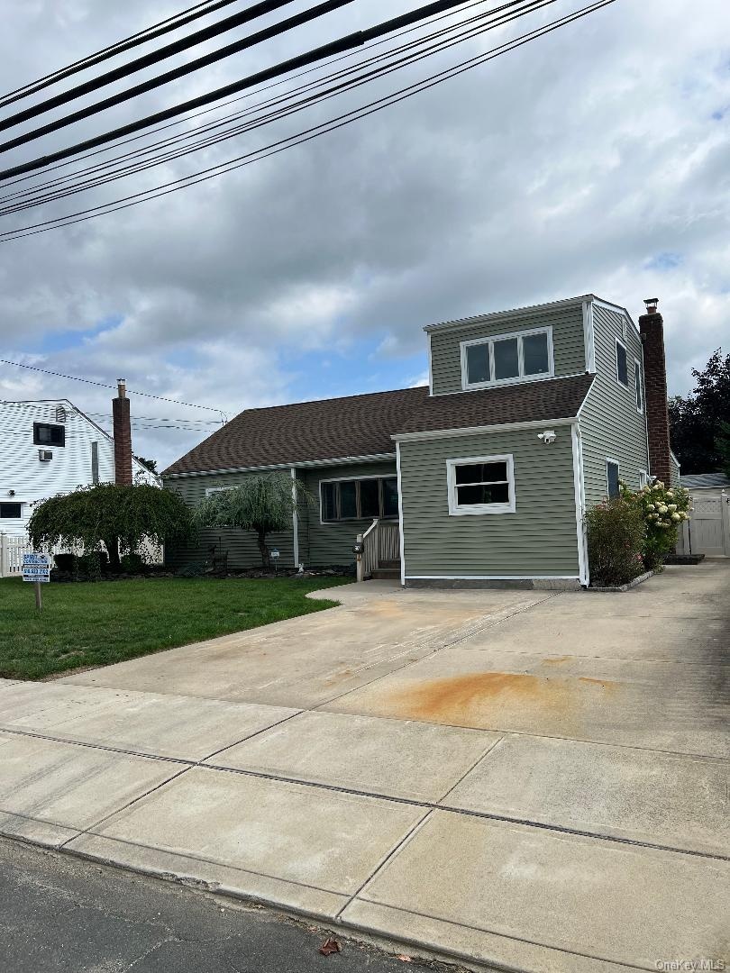 - View of front of home featuring a front lawn, a shingled roof, and driveway