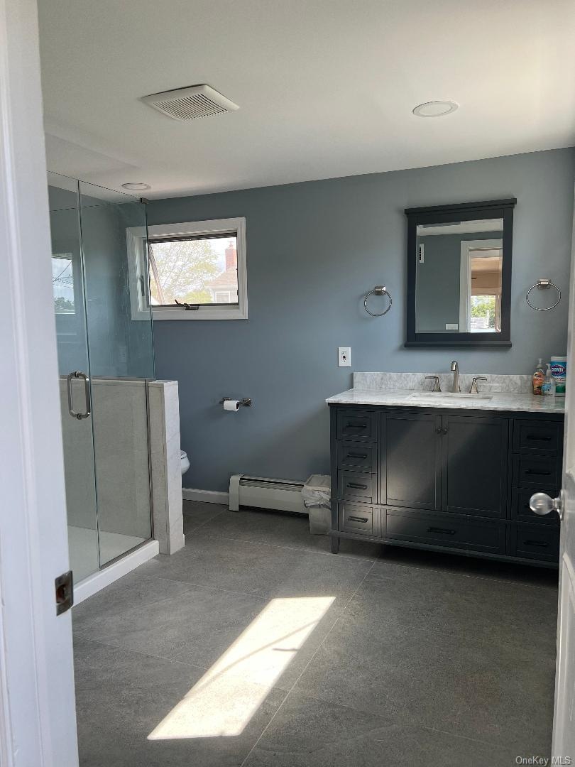 - Full bathroom with vanity, a stall shower, and baseboard heating
