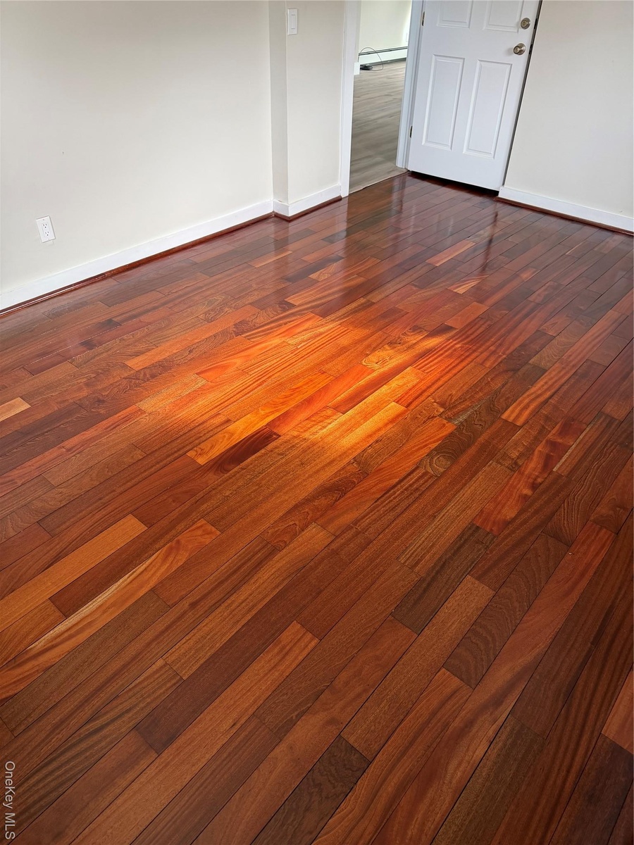 - Unfurnished living room with wood finished floors and a baseboard heating unit