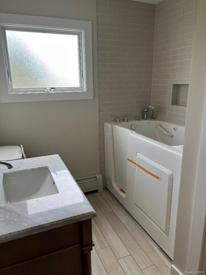 - Bathroom with a bath, vanity, baseboard heating, and wood tiled floors