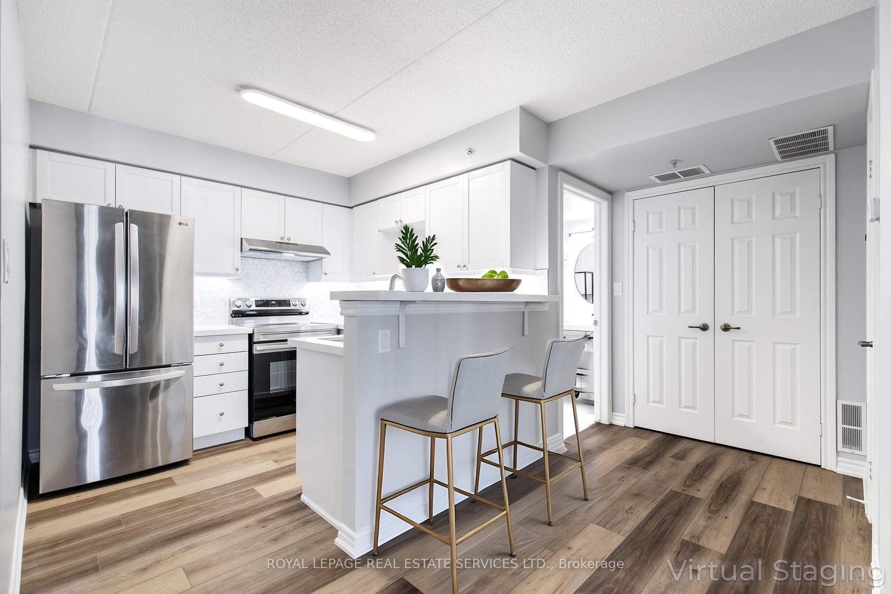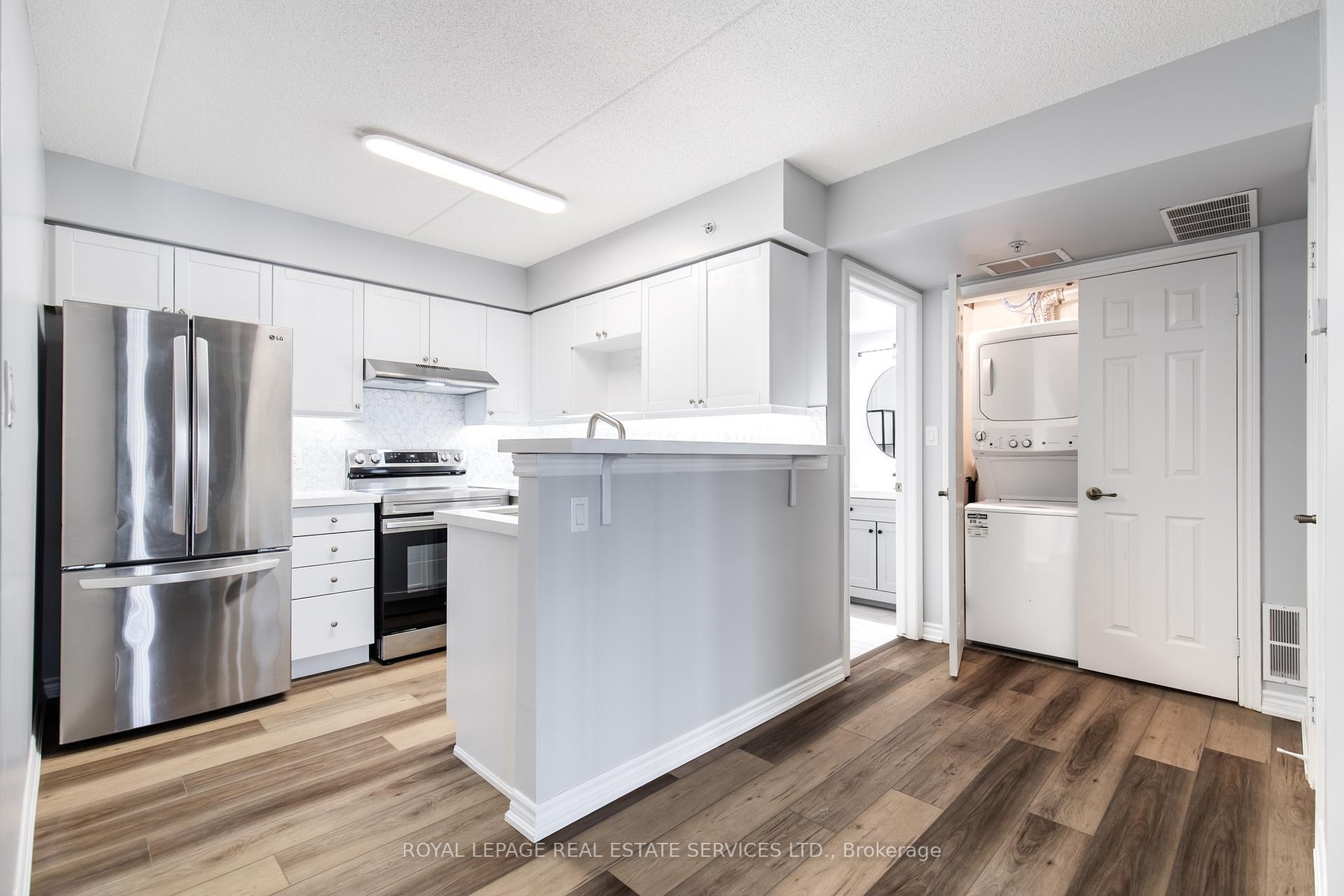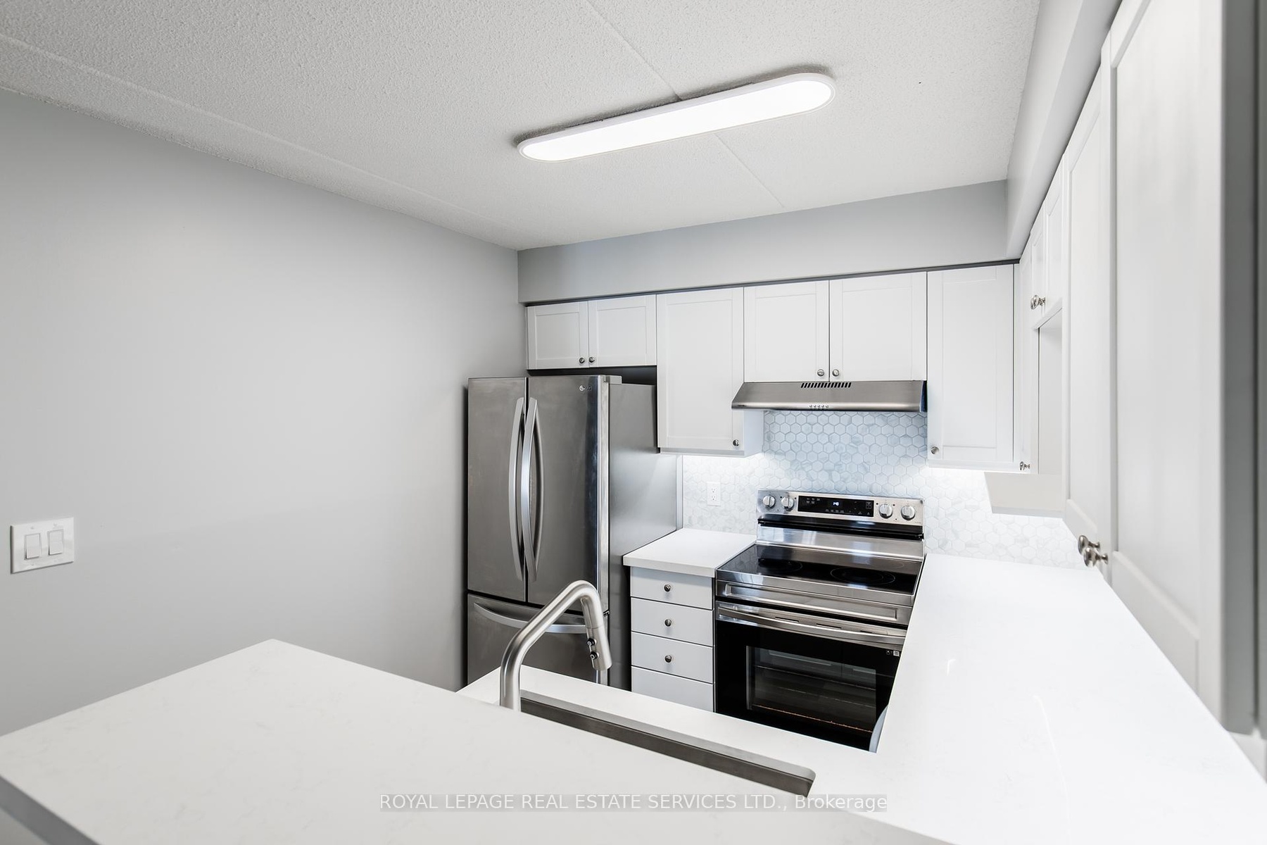 Located in Oakvilles prestigious Glen Abbey neighbourhood, this beautifully updated 1 Bedroom + Den, 1 Bathroom condo offers an open-concept layout with new flooring (2025) and a living/dining area with walk-out to balcony. The kitchen features stainless steel appliances, as well as updated: countertops, backsplash, new lighting including under-mount, sink, faucet and dishwasher (2025). The 4-piece Bathroom offers updated vanity and lighting. The Bedroom includes built-in closet organizers and the versatile Den is perfect for home office or second bedroom. Additional features include convenient in-suite laundry, linen closet and private locker storage accessible from the balcony. Amenities include: fitness centre, party room and visitor parking. Close to parks, shopping, top schools, Oakville Hospital, highways and GO, this condo is a perfect choice for first-time buyers, down-sizers, or investors seeking a stylish, low-maintenance home in one of Oakvilles most desirable communities.