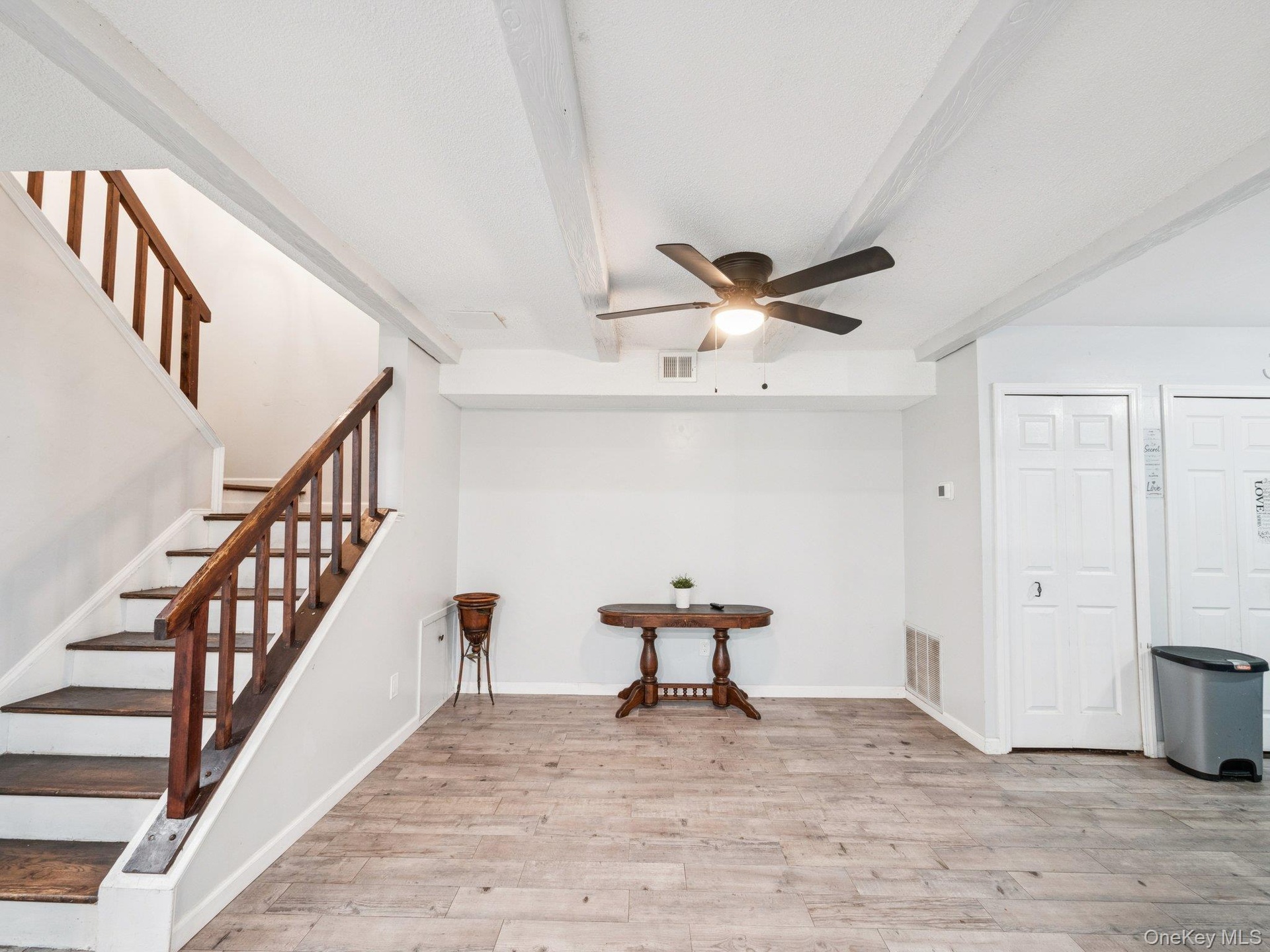 - Staircase featuring beam ceiling, tiled finished floors, and ceiling fan. Under stair storage.
