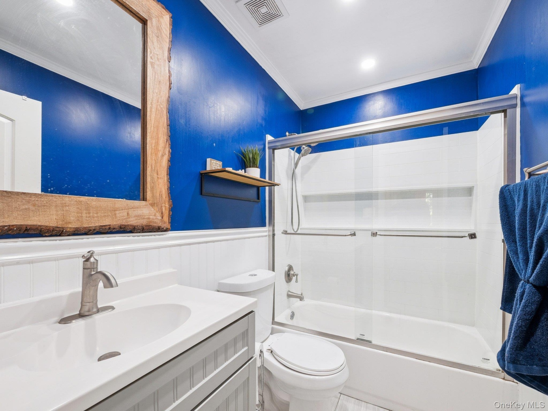- Bathroom featuring crown molding, combined bath / shower with glass door, vanity, and wainscoting