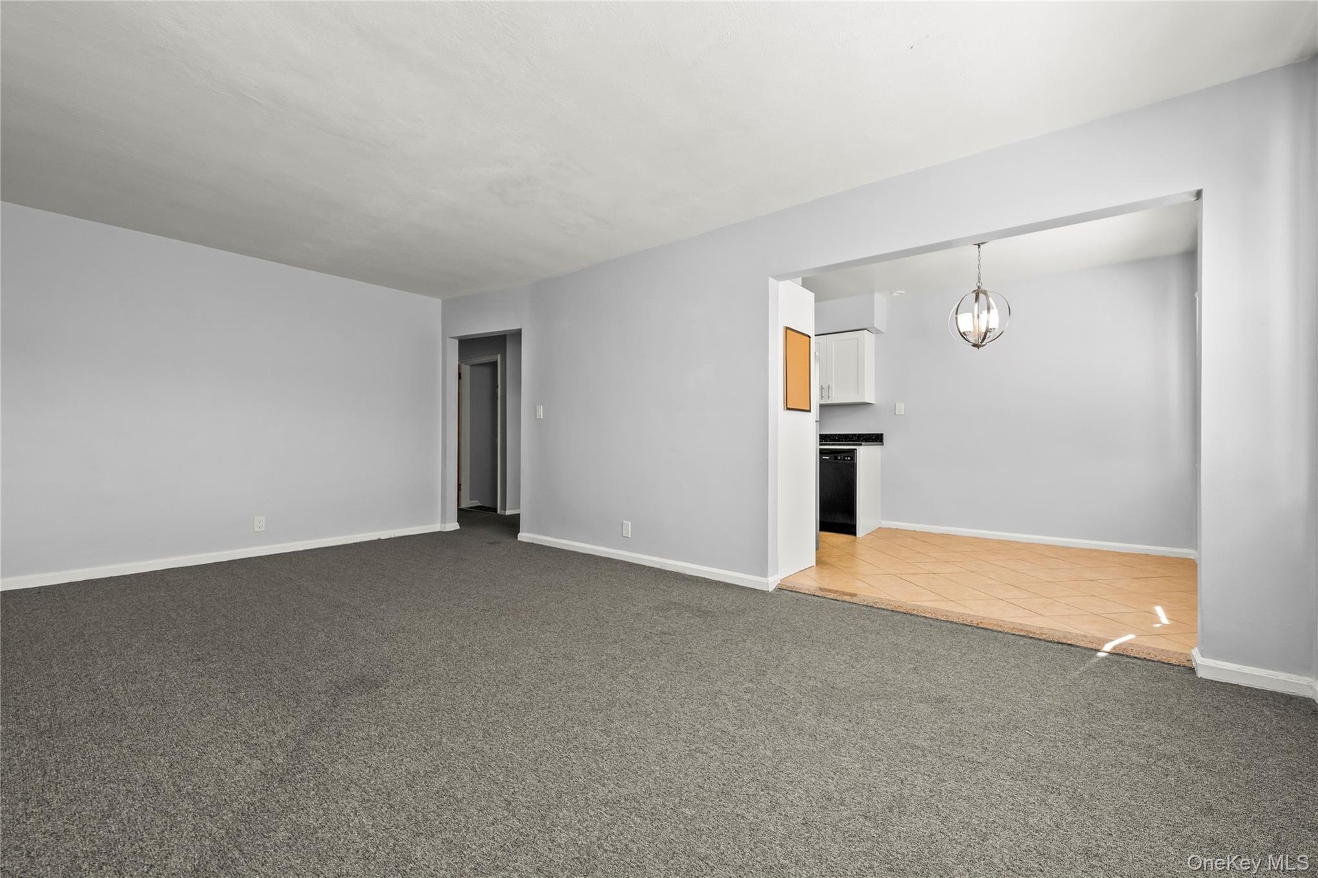 - Unfurnished living room with light carpet, a chandelier, and light tile patterned floors