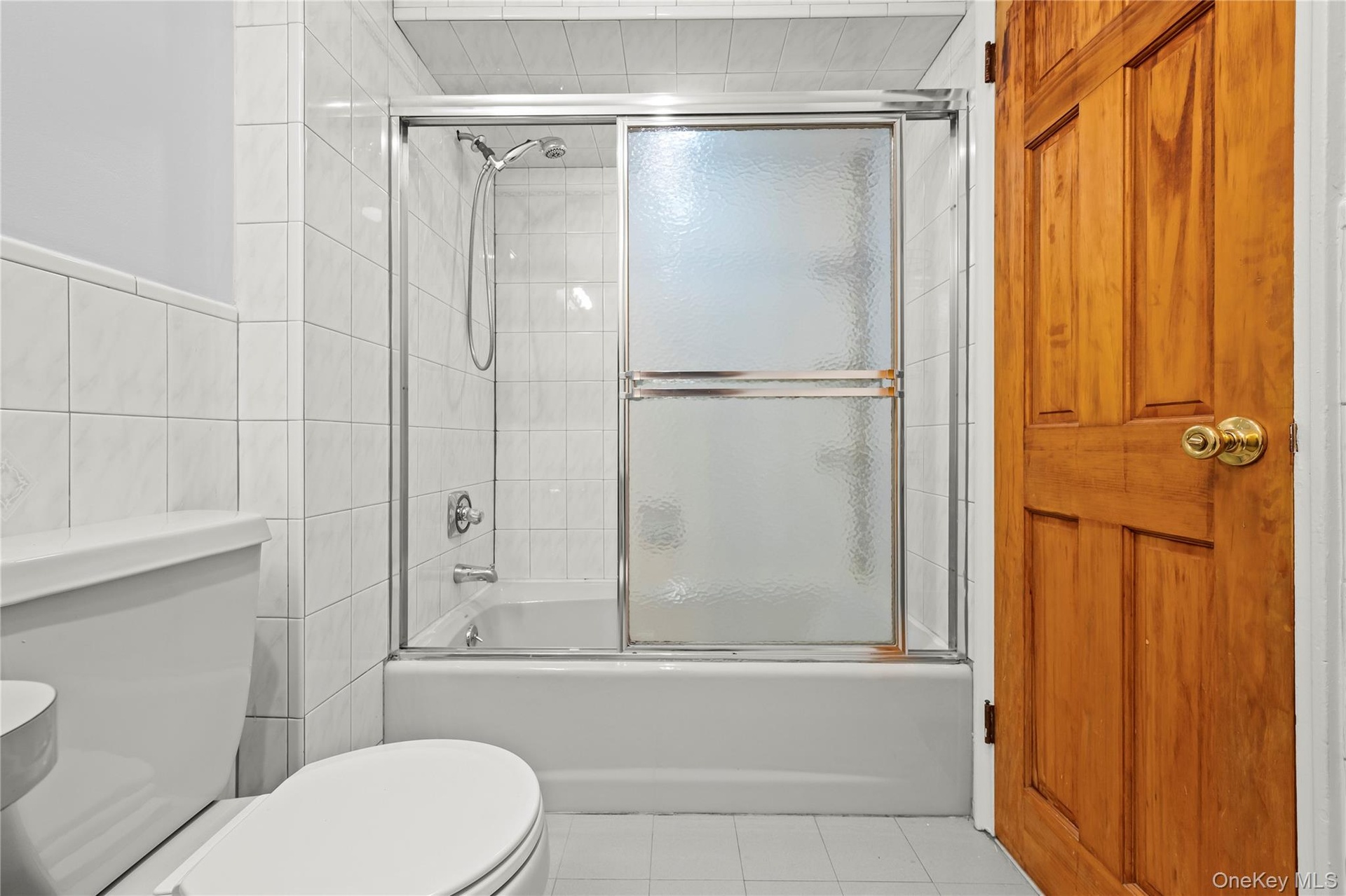 - Full bathroom featuring tile walls, bath / shower combo with glass door, and tile patterned flooring