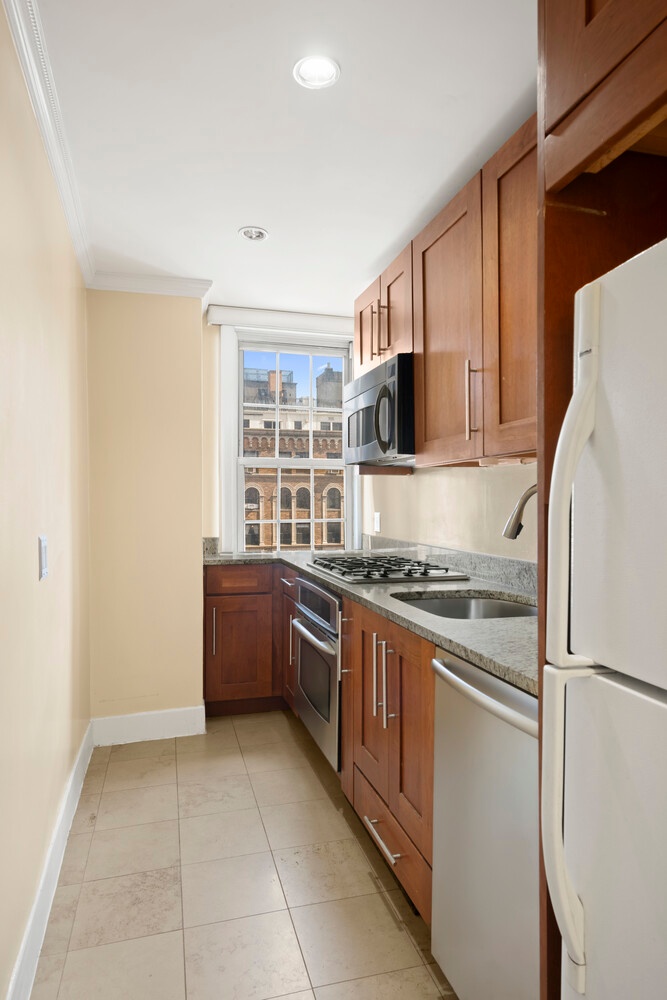 The recently updated kitchen and bath offer contemporary finishes and convenience, complementing the apartment's graceful prewar details. Ample closet space ensures practicality meets style, while the home's quiet ambiance makes it a true retreat in the heart of the city.