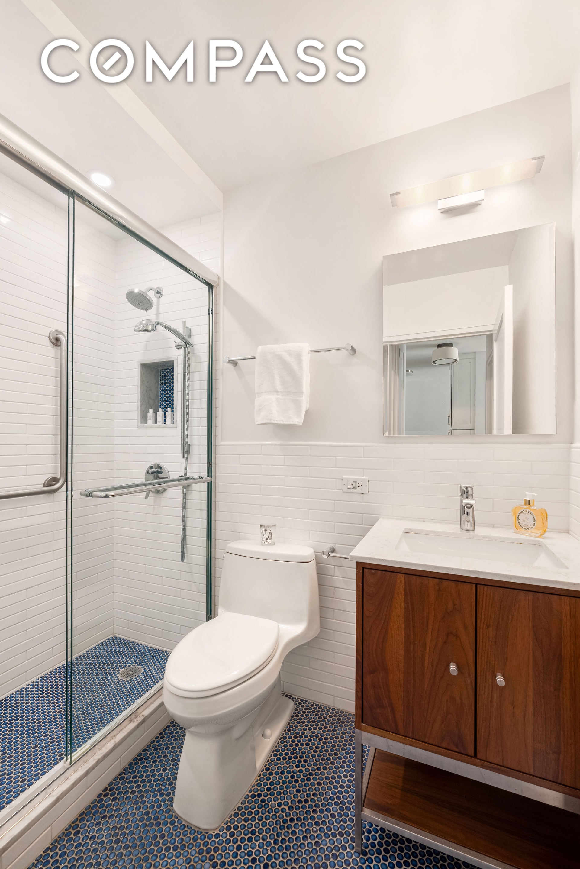 The renovated bathroom features a glass-enclosed shower, contemporary fixtures, and blue penny-tile floors. Ample closet space throughout the apartment completes this well-designed home.