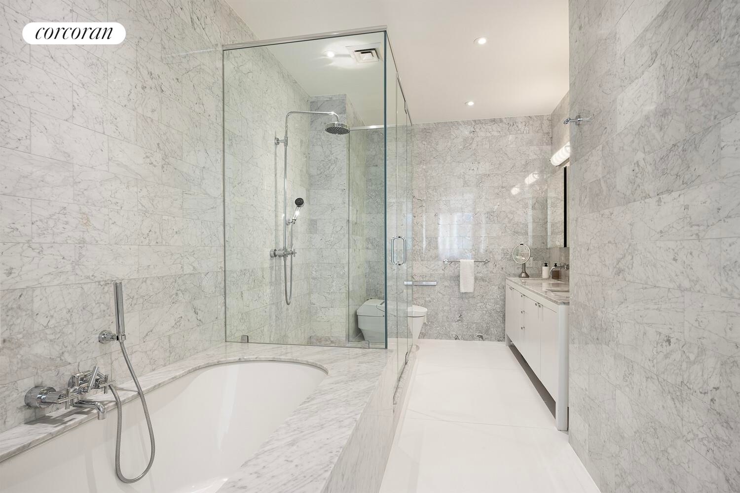 A private elevator opens directly into the loft, where an impressive Great Room with a gas fireplace is framed by a wall of floor-to-ceiling windows overlooking Mercer Street. The open Bulthaup kitchen features stainless steel countertops, Sub-Zero, Gaggenau, and Miele appliances, and a vented cooktop, with an adjacent dining area that comfortably seats 10-perfect for entertaining.