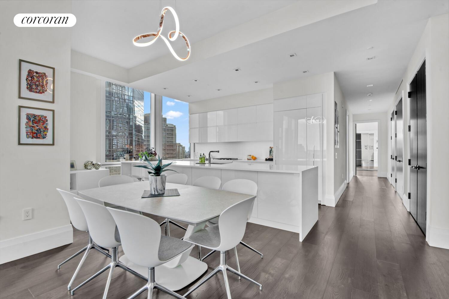 A gracious entry foyer opens to an expansive open-plan living and dining area, anchored by a custom Molteni-designed kitchen. Featuring a waterfall eat-in island, high-gloss cabinetry, Statuary Quartz and Luce De Luna slab countertops, and an Ann Sacks mosaic backsplash, the kitchen is equipped with a full Miele appliance suite, wine storage, and concealed smart storage.