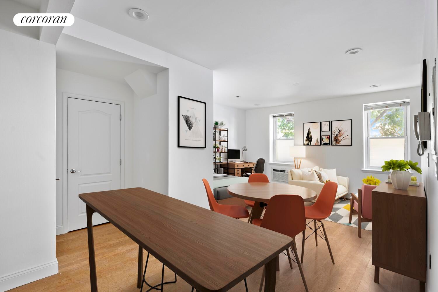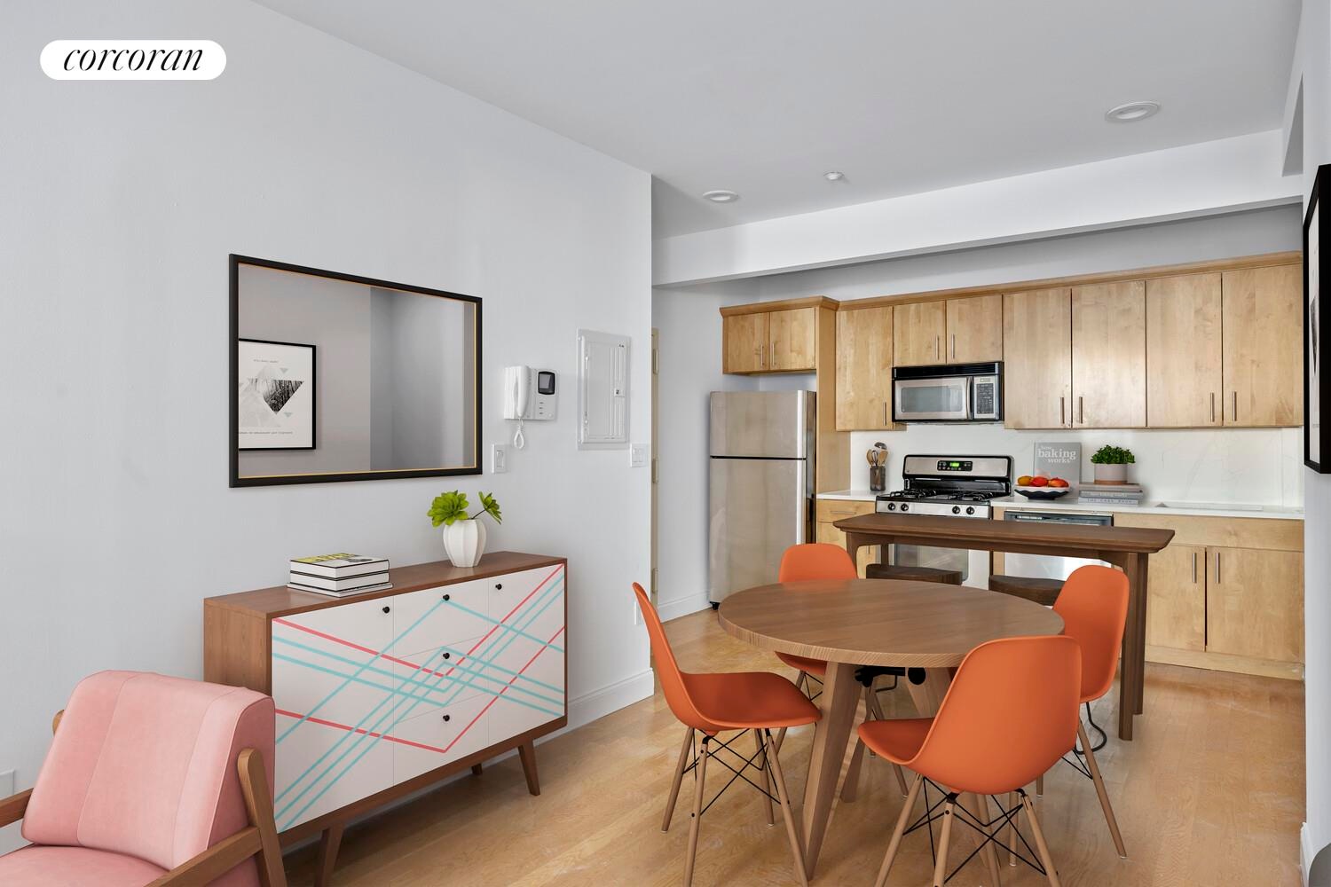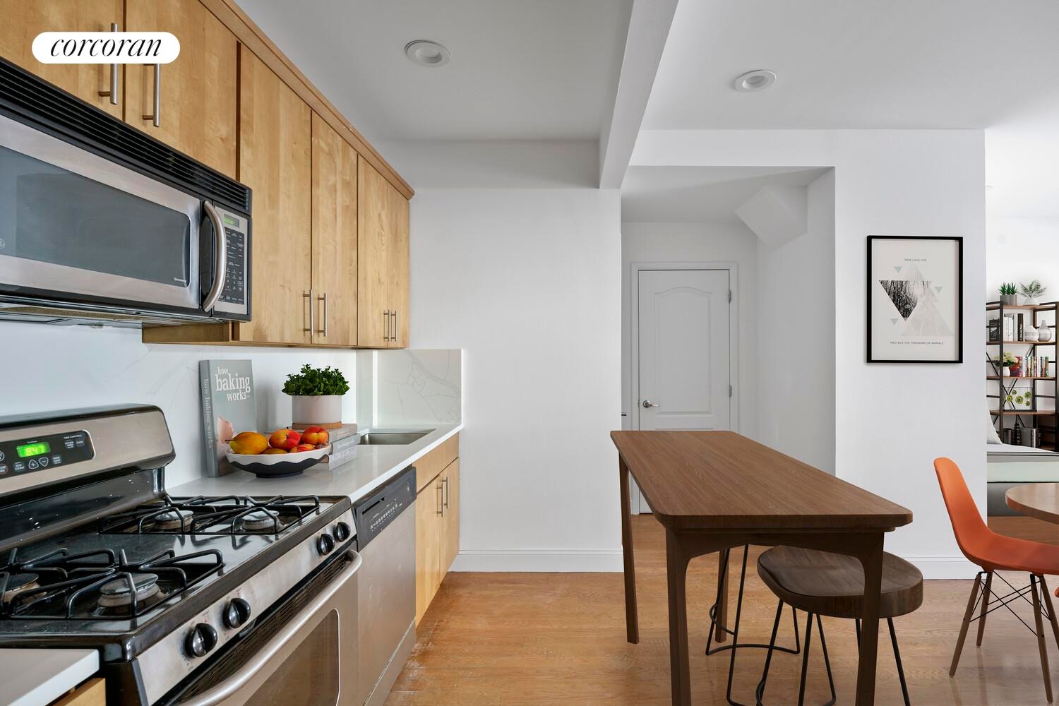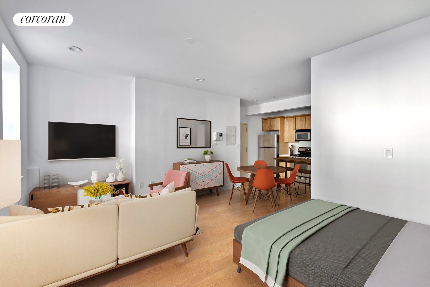 In the very heart of Clinton Hill lies an incredibly charming alcove studio waiting for a new owner to call home. This move-in-ready, elegantly renovated apartment has a flexible layout beginning with a tastefully updated open kitchen and a full array of stainless steel appliances and a brand new quartz countertop. There's plenty of room to add a floating kitchen island and a dining table. The alcoved space fits a queen size bed perfectly with additional space in the living area for a cozy entertainment setup. You'll get plenty of light beaming in and filling the apartment with 9-foot ceilings. On top of that, the building is expertly managed and maintained with laundry facilities in the basement and video virtual doorman intercom for each unit. Why rent when you can own your very own condo with the lowest monthlies you'll find in this area. An option to swap in an in-unit combo washer/dryer is available.
