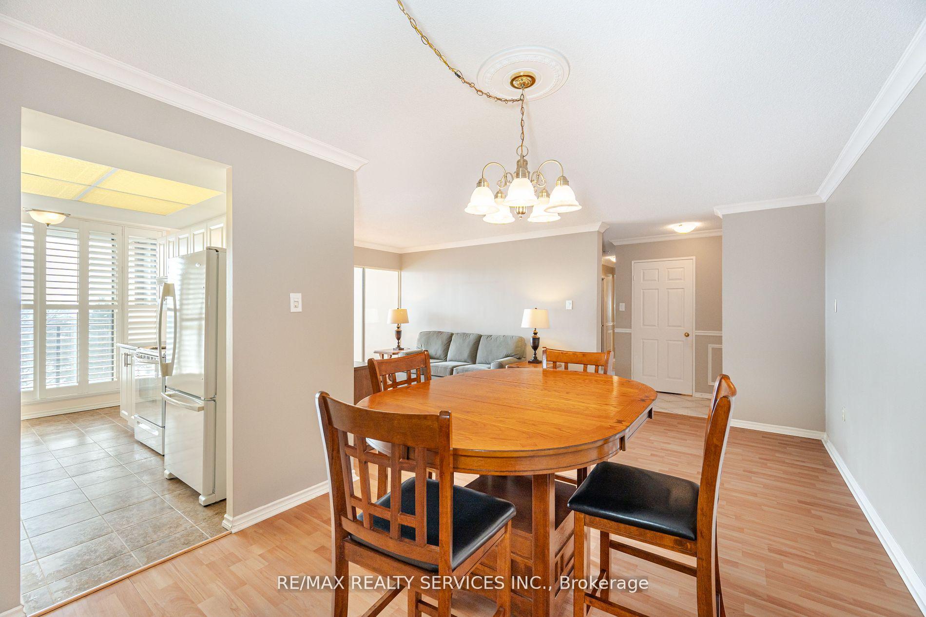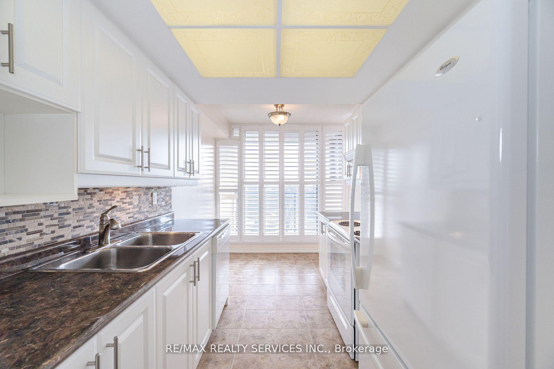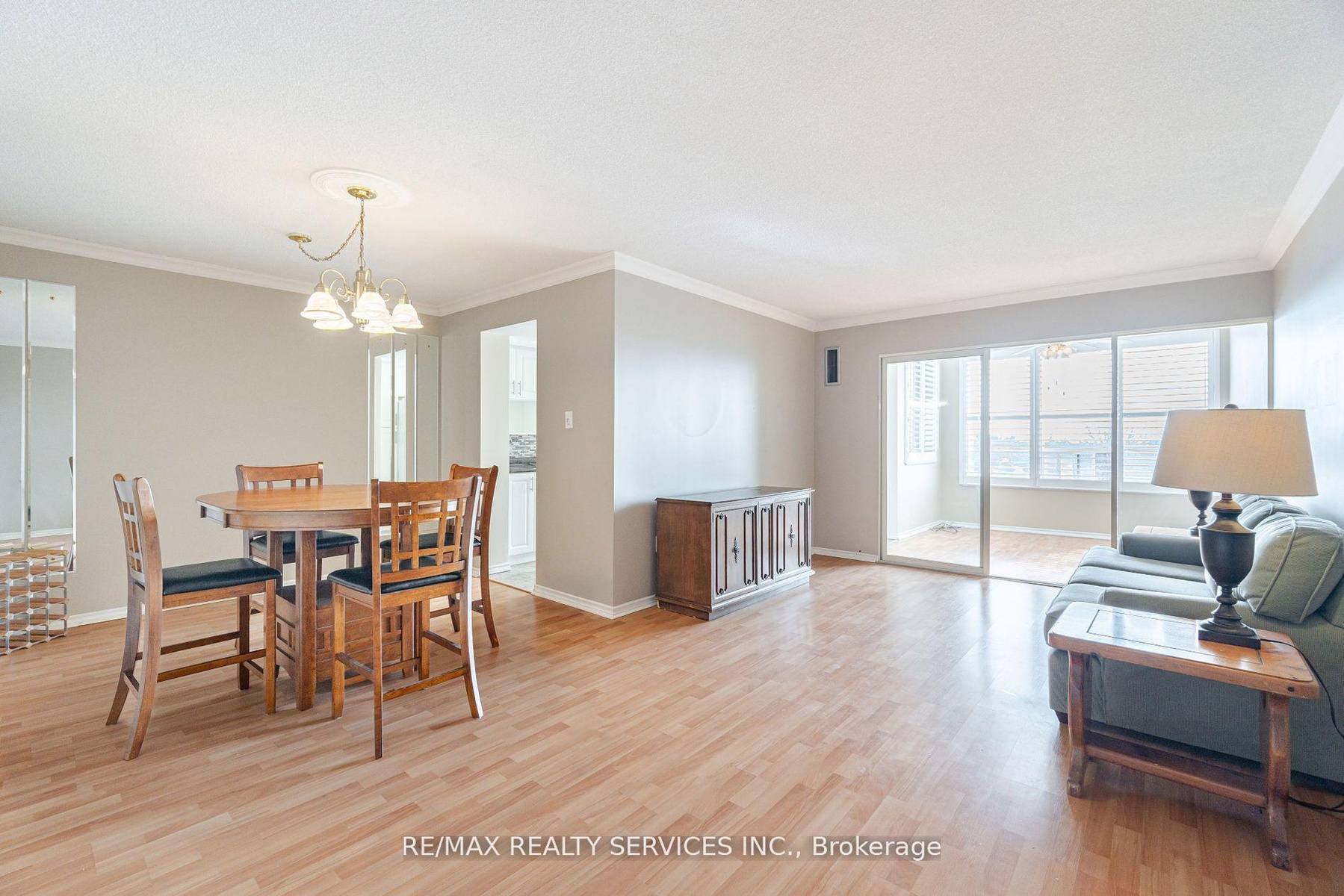 The Crown West condos offers 1267 ft of spacious living space. Bright white kitchen with backsplash and appliances & breakfast area with walk out to an open balcony overlooking the gardens and south exposure which equals maximum sunlight. The open concept , dining/living area that features laminate flows gracefully to the adjacent & versatile den, ideal for a home office. Generously sized 2 bedrooms + 2 bathrooms (4 pce + 3 pce) + ensuite laundry. Walk to Longos grocery, restaurants + shops. Enjoy strolls by Fletchers Creek, Ravine + parks. Steps to transit & conveniently located near Highways 401, 410, 403 & 407. 1 parking spot. **EXTRAS** Maintenance fees cover all utilities: gas, hydro, water, building insurance, cable tv + internet. Condo amenities incl: security guard, outdoor pool w/ bbq area, sauna, hot tub, exercise room, tennis & squash courts, library, billiards and party room