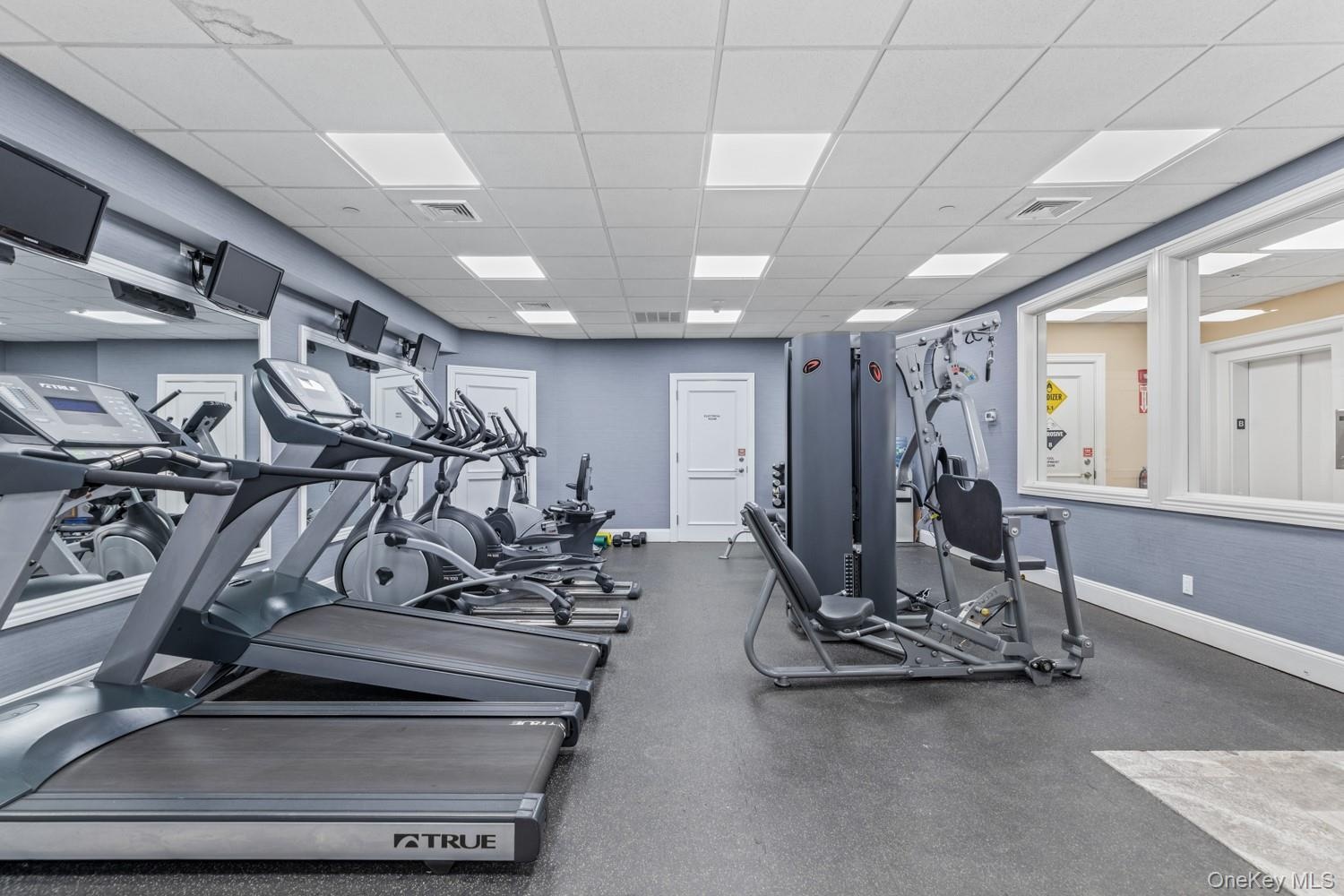 - Workout area featuring a drop ceiling and elevator