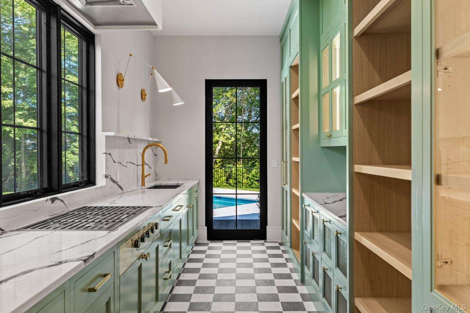 - Prep Kitchen with green cabinetry, light floors, stainless steel gas stovetop, and light stone countertops