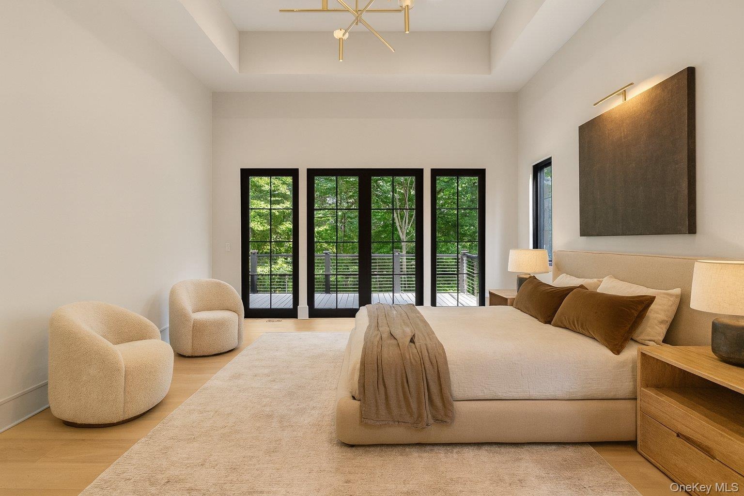 - 1st Floor Primary Bedroom featuring light wood-style floors, a raised ceiling, and access to outside