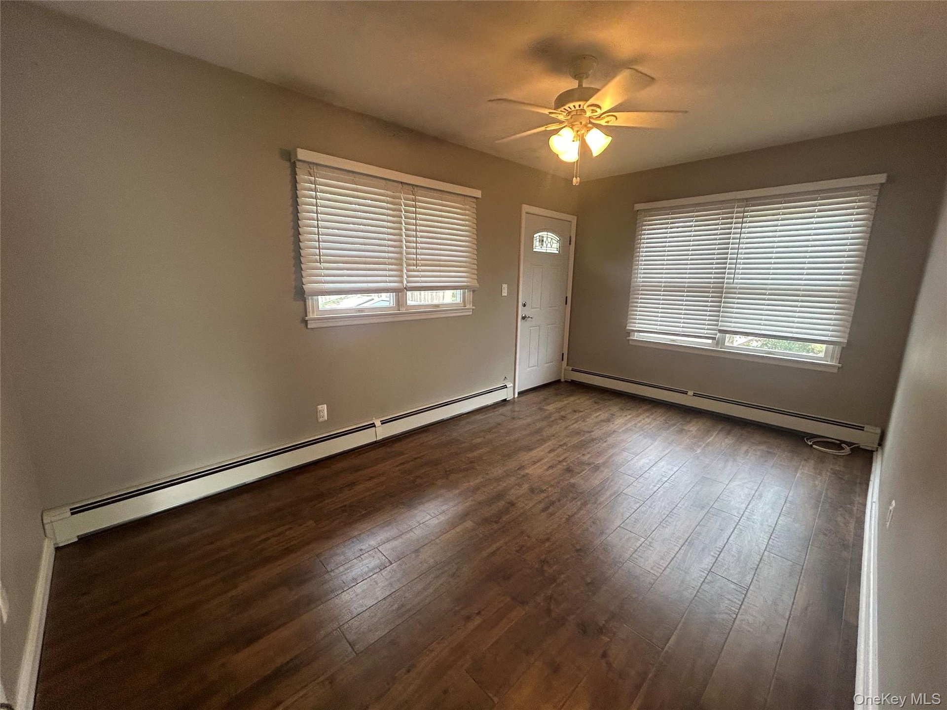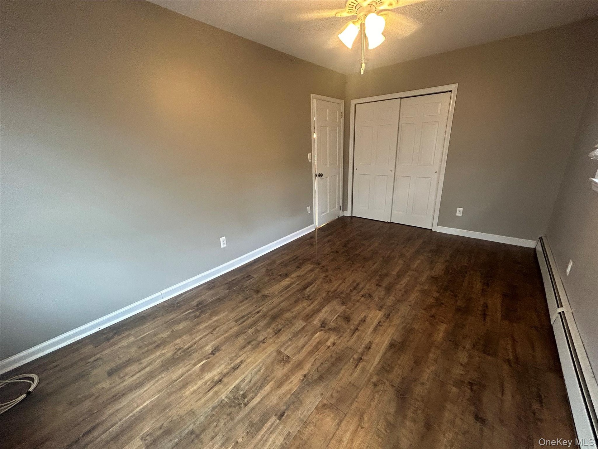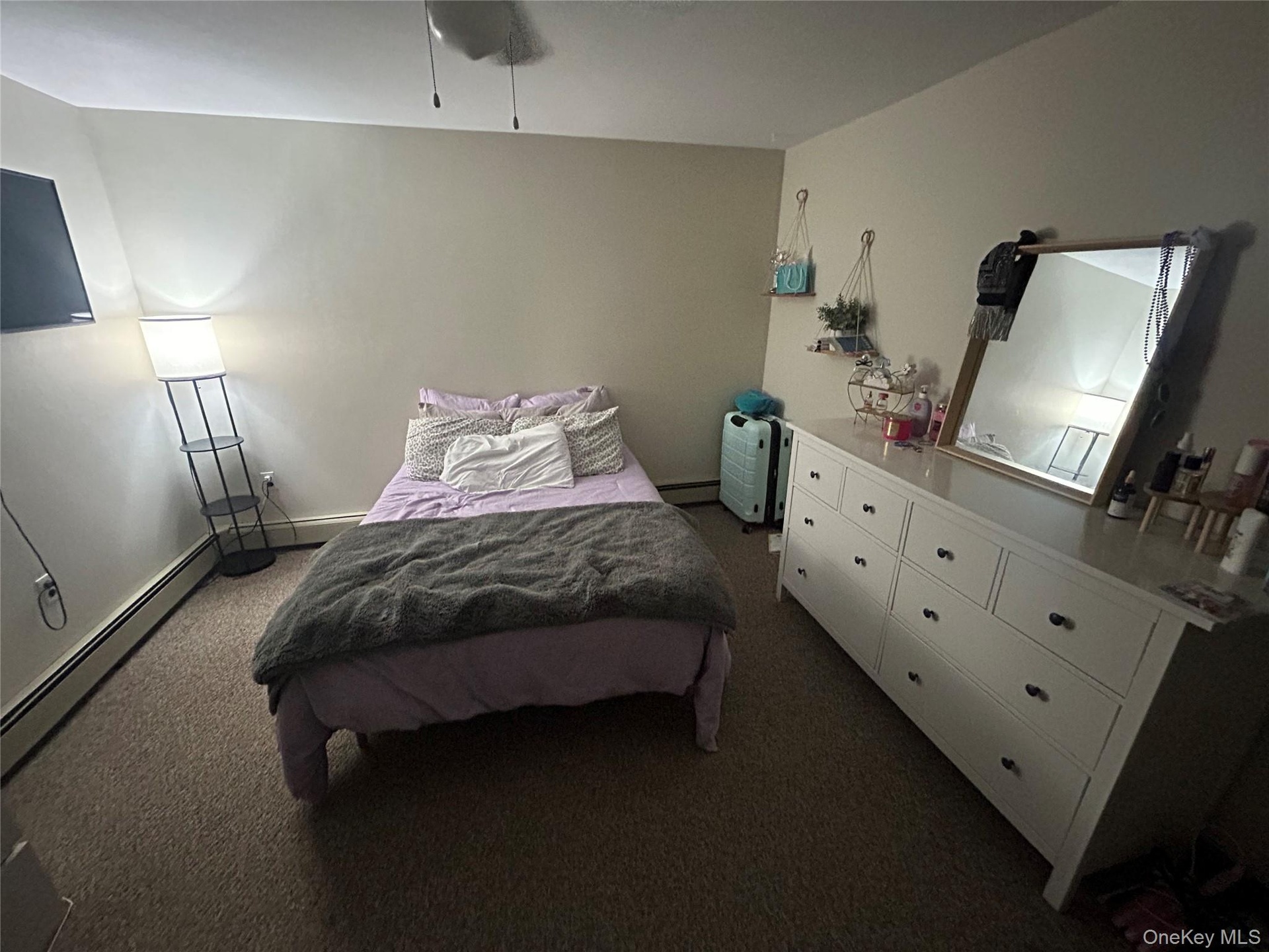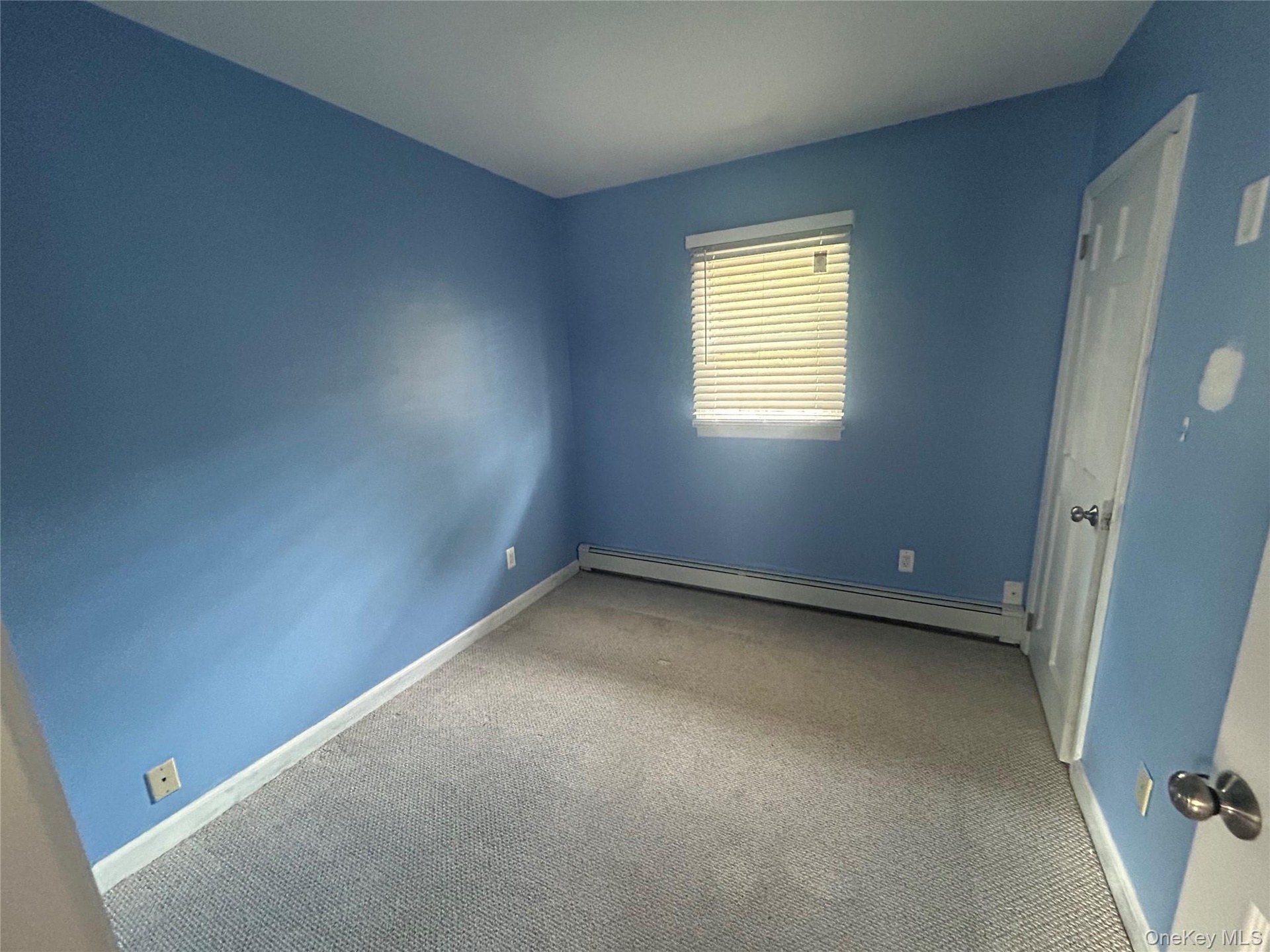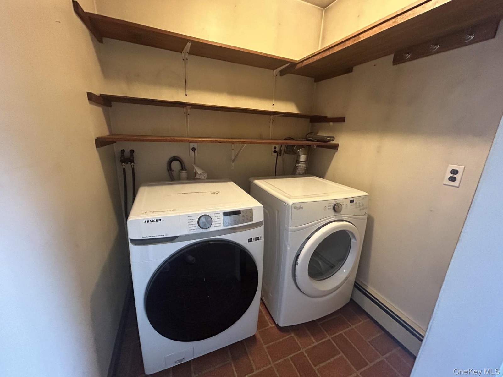 - Laundry room featuring a baseboard radiator and washer and dryer