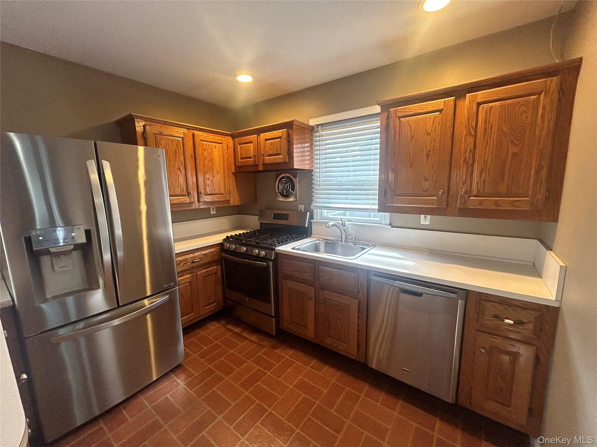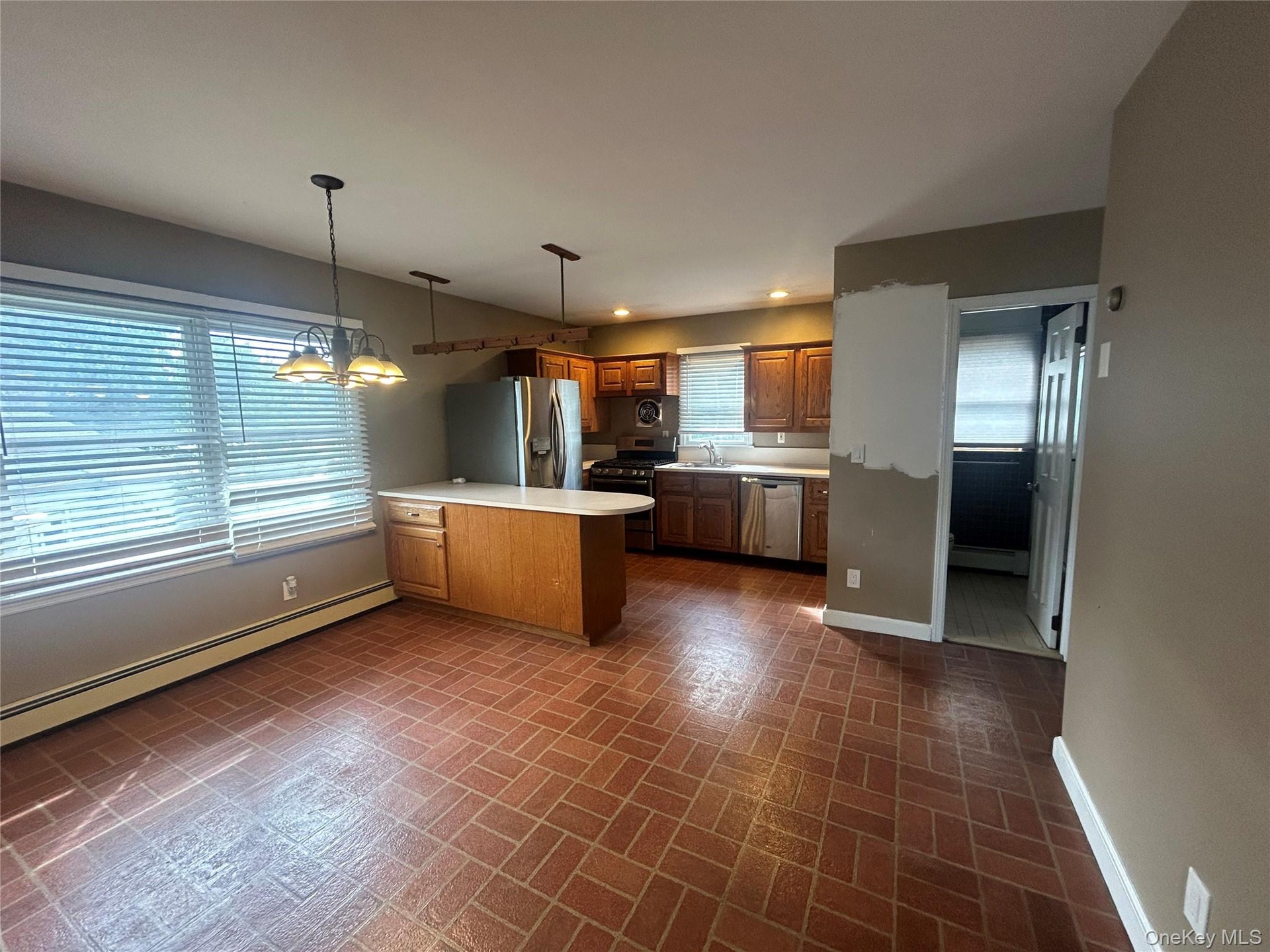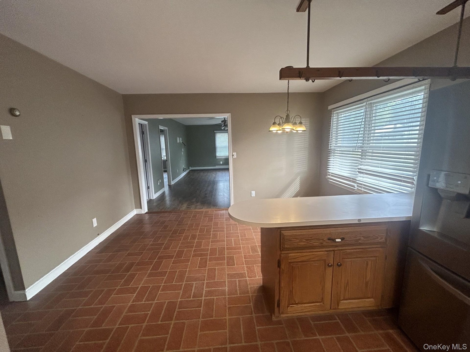 - Kitchen with a peninsula, stainless steel refrigerator with ice dispenser, light countertops, brick patterned flooring, and hanging light fixtures