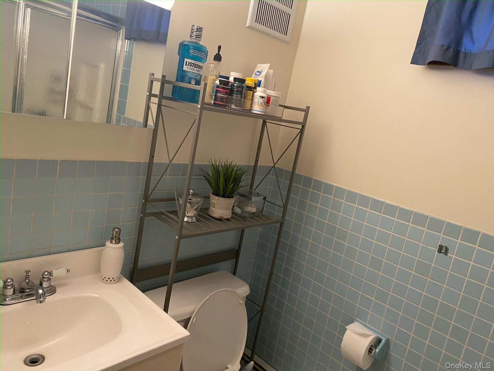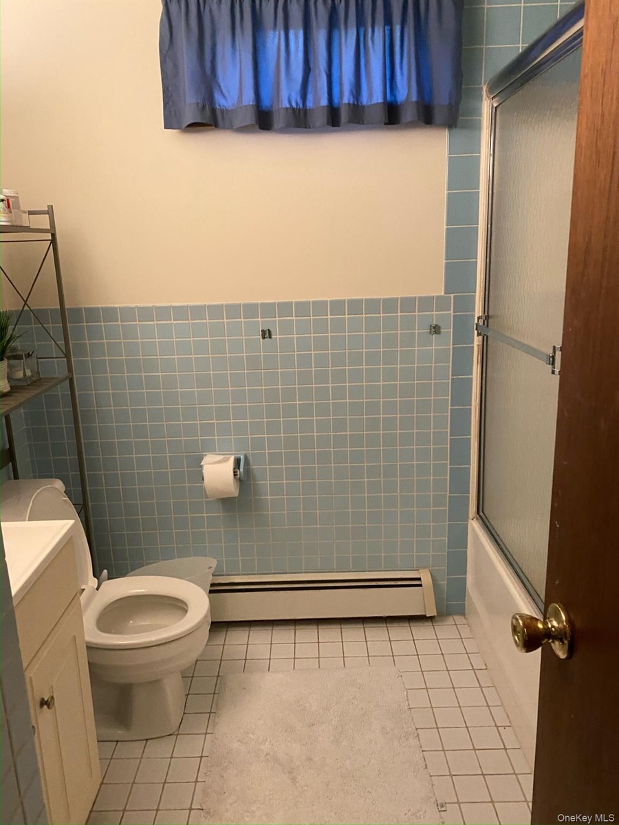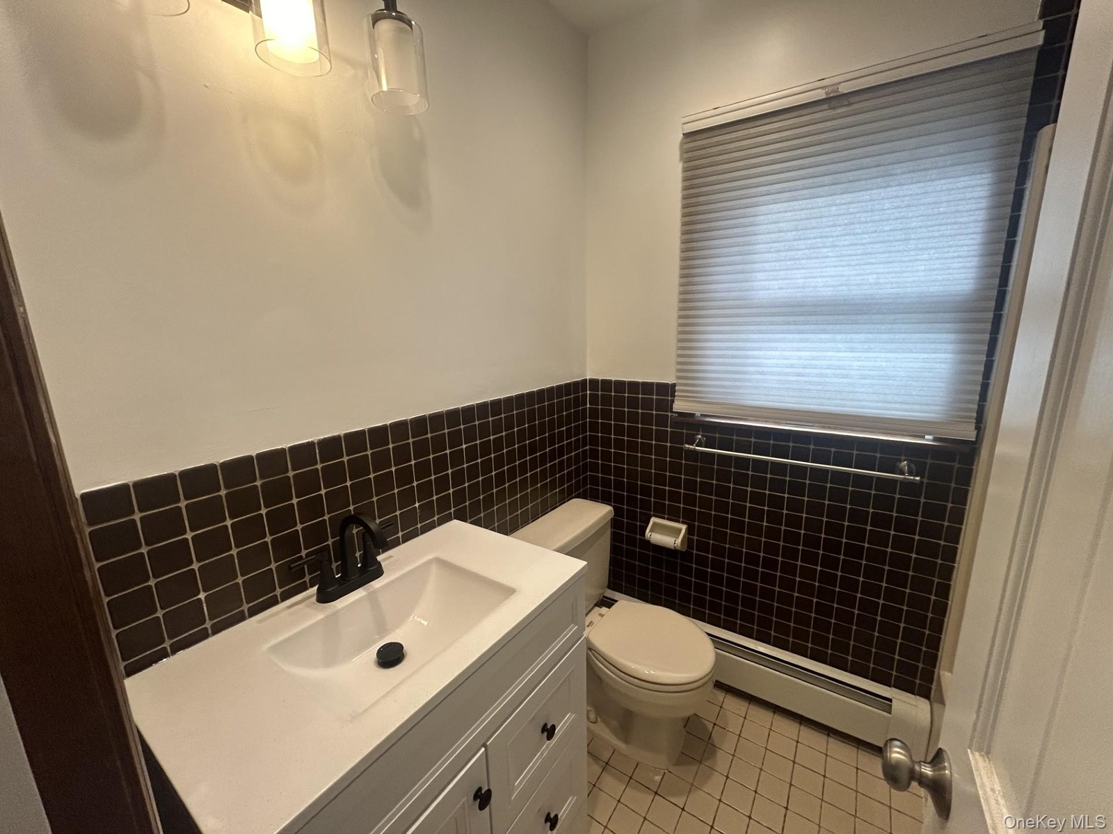 - Bathroom with light tile patterned floors, vanity, tile walls, baseboard heating, and wainscoting