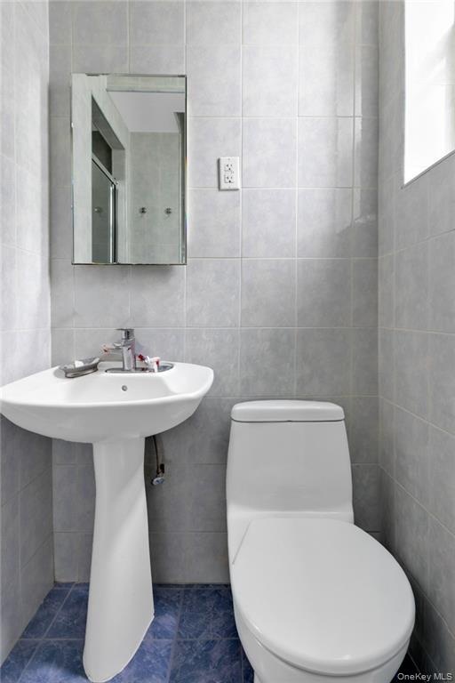 - Bathroom featuring tile walls and dark tile patterned floors