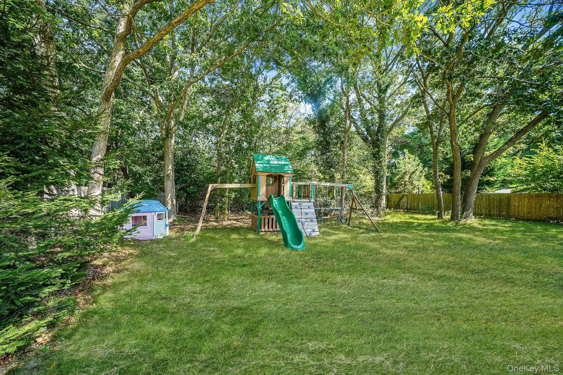 - Fenced backyard featuring a playground, a shed, and view of wooded area