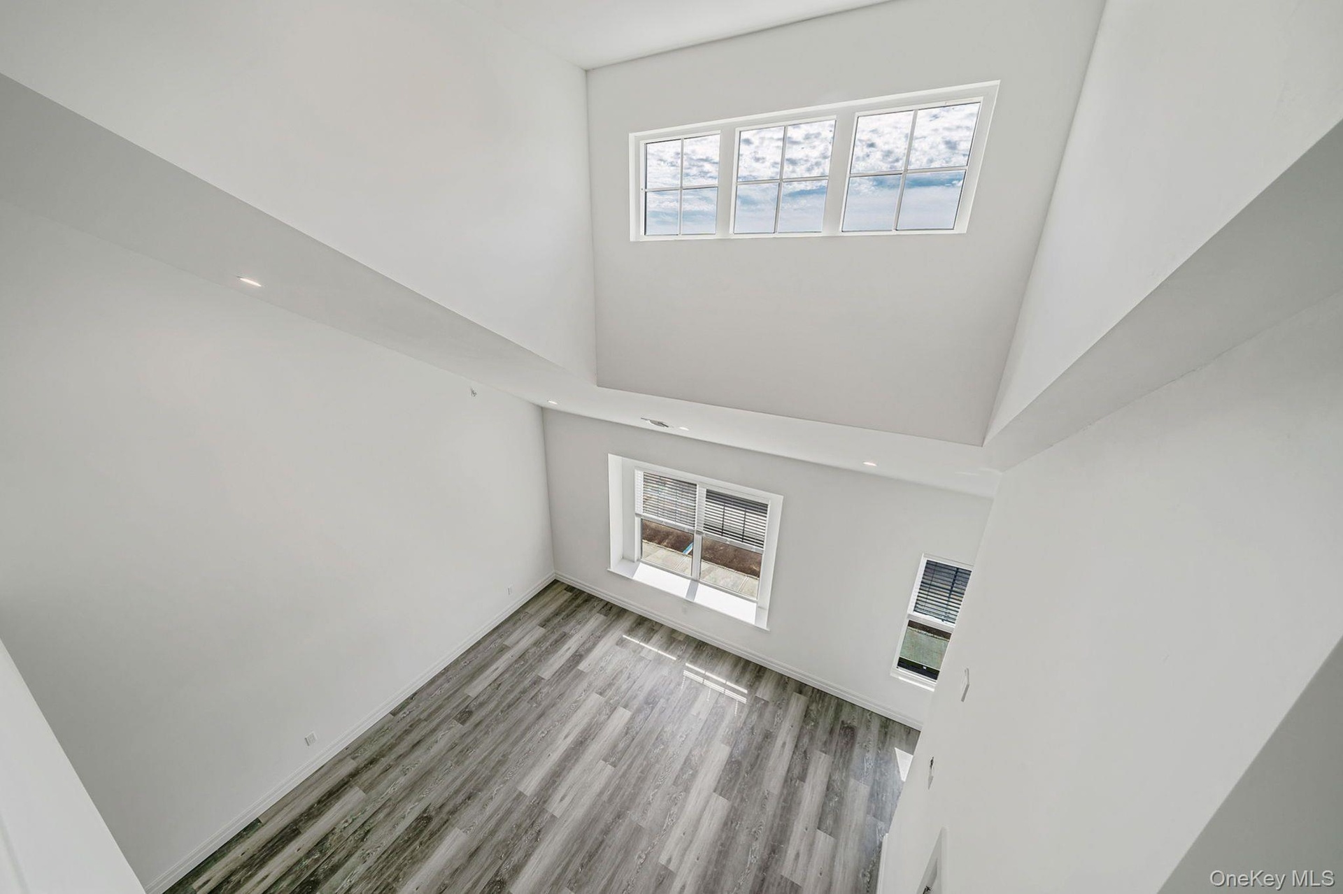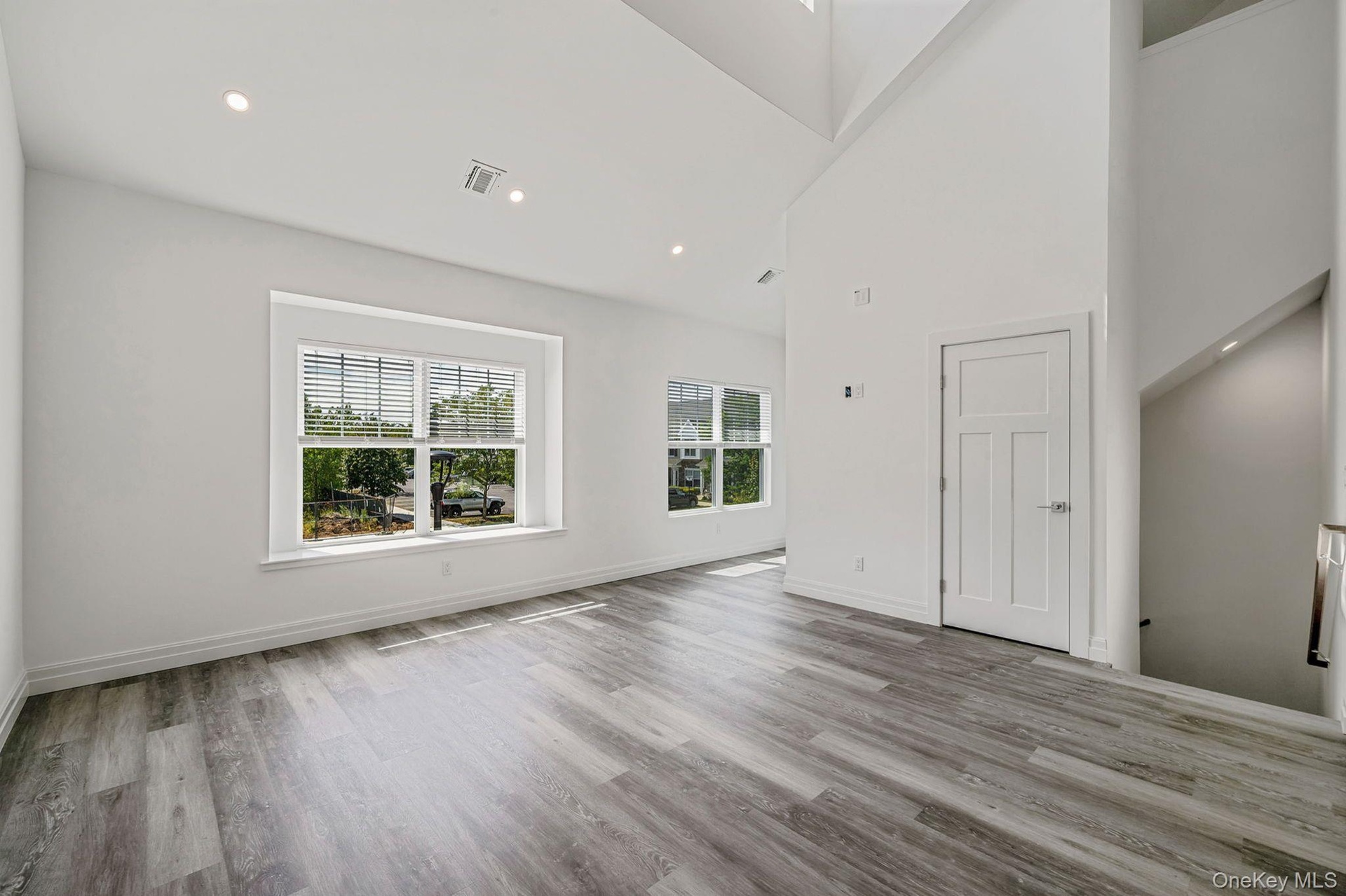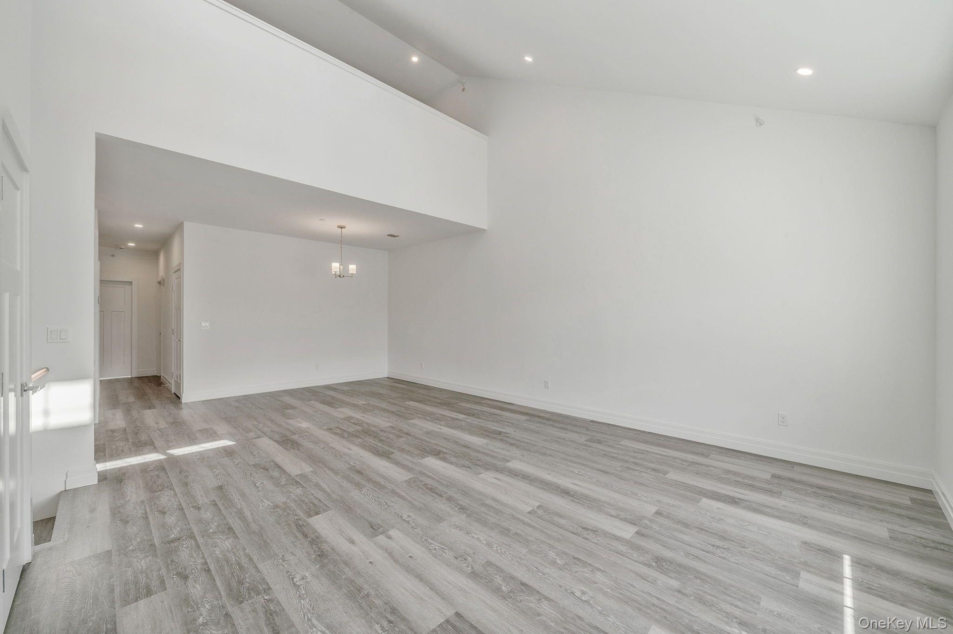 - Unfurnished living room featuring recessed lighting, light wood-type flooring, and high vaulted ceiling