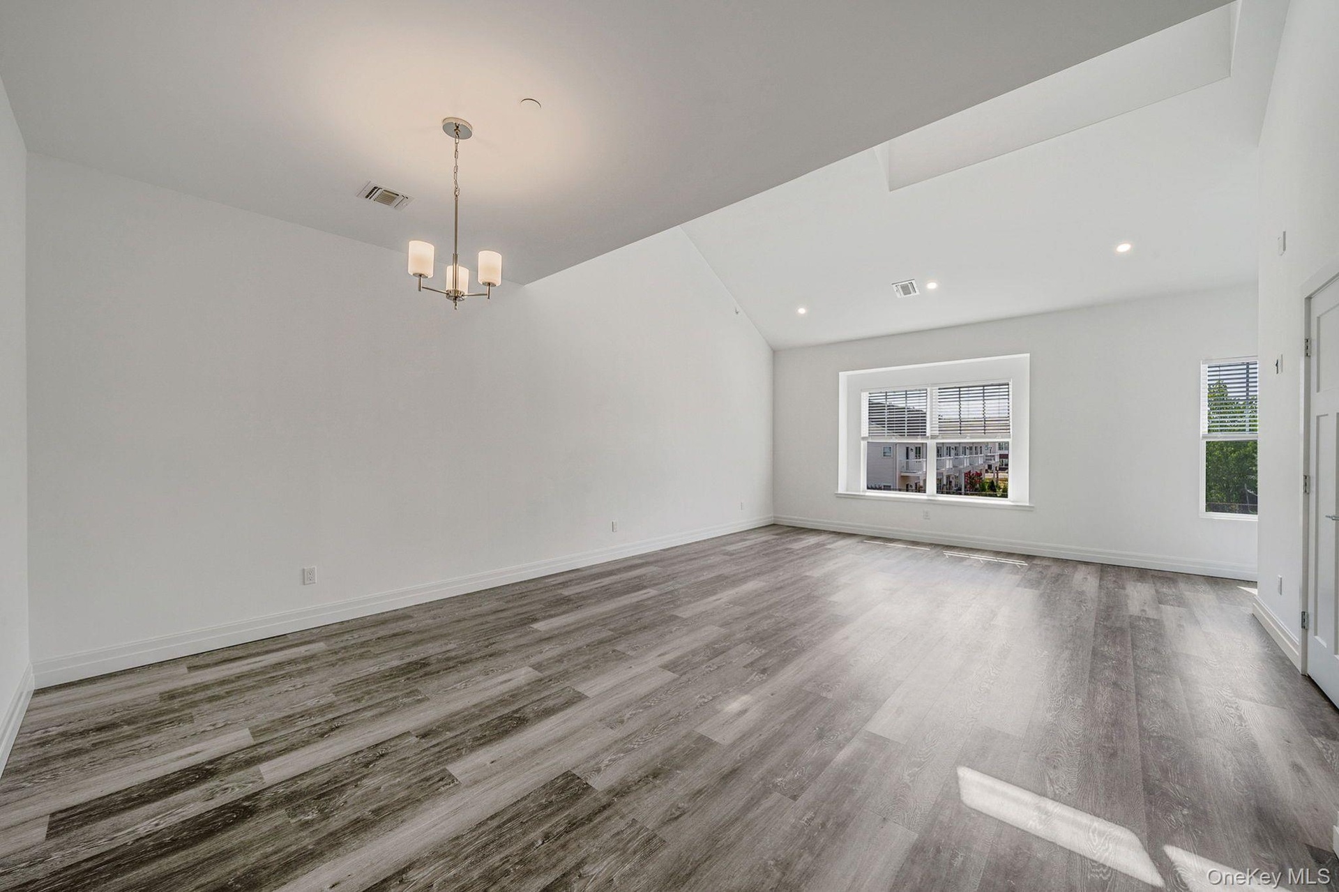 - Unfurnished living room featuring recessed lighting, light wood-type flooring, a chandelier, and vaulted ceiling