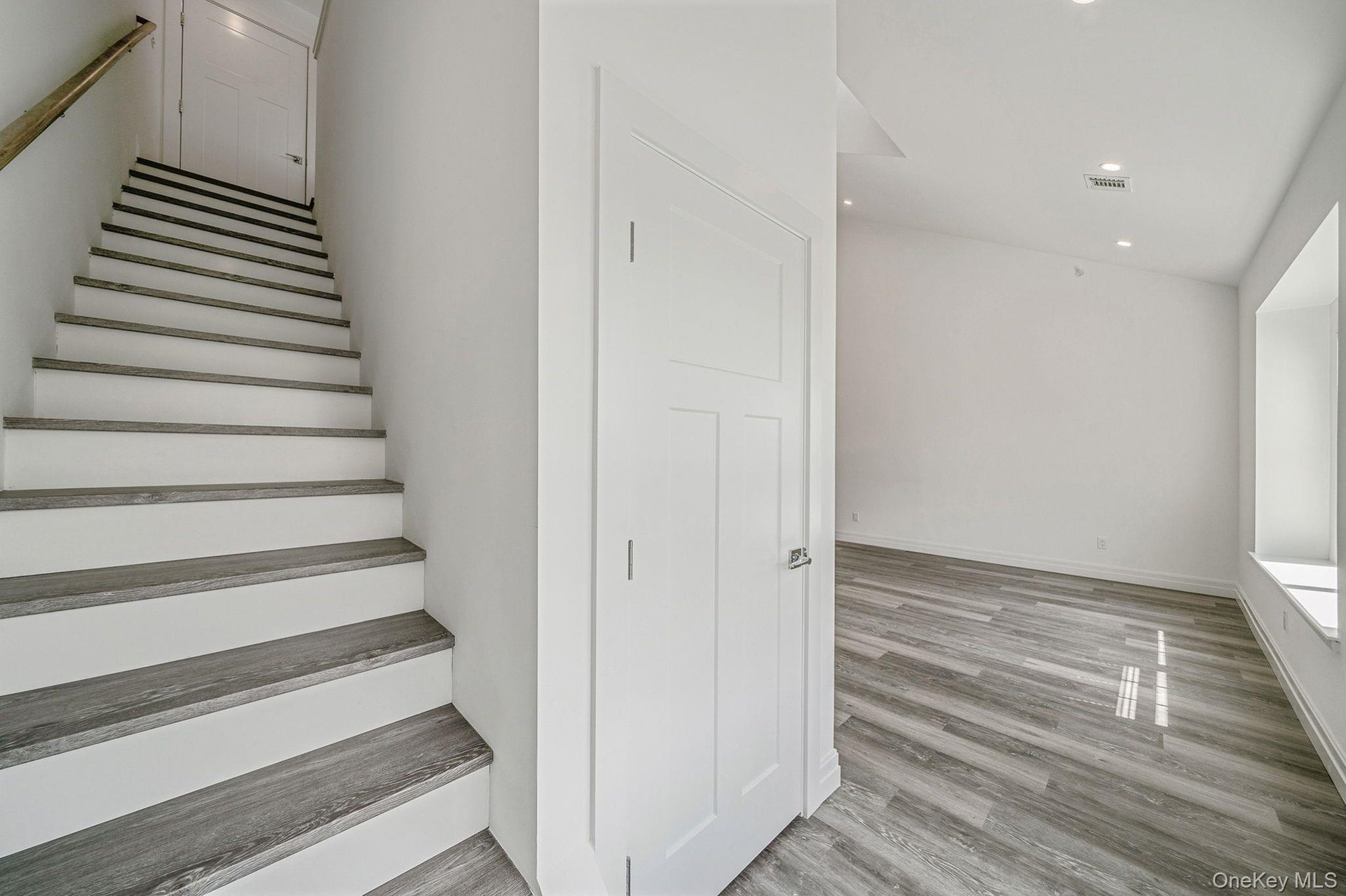 - Stairway with recessed lighting and wood finished floors