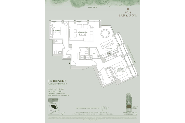 Enter via a semi-private elevator entry vestibule: The foyer opens to the elegant entertaining room, revealing the contemporary interior that blends bold design with effortless livability. Large sliding doors with glass balustrades are unique to this apartment allowing the outdoors in. The open kitchen with Miele appliances is a masterpiece of craftsmanship, featuring custom white oak cabinetry and sculptural tundra gray marble islands with waterfall edges that have been extended to the front. A Juliette balcony is perfect for an urban herb garden. The primary bedroom suite features another set of Juliette balconies overlooking the sublime Potter Building and City Hall Park. The closets are expertly fitted out. In the en-suite primary bathroom, book-matched Montclair Danby marble and radiant heated floors create a modern European spa ambiance. The second bedroom suite is positioned at the opposite end of the apartment, facing the park with a balustraded sliding door. A powder room, hall closet and washer/dryer closet are additional attributes.