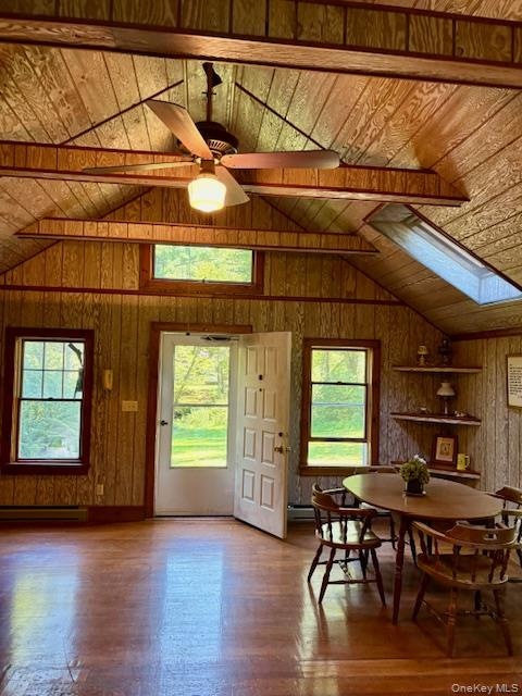 - Guest House Dining space with wood walls, vaulted ceiling, wood finished floors, wood ceiling, and a ceiling fan
