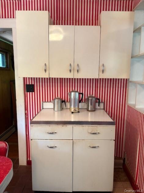 - Kitchen vintage cabinets, sink on right, many shelves.