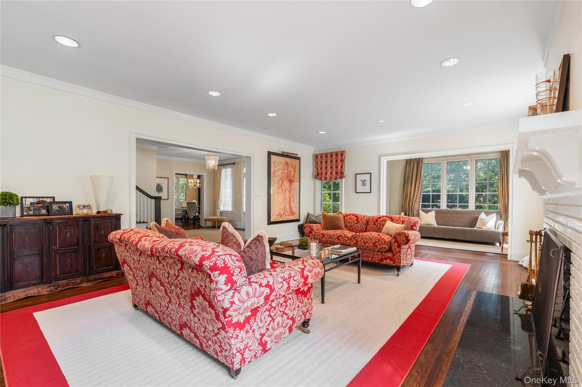 - The generously-scaled formal living room with several sitting areas and fireplace.