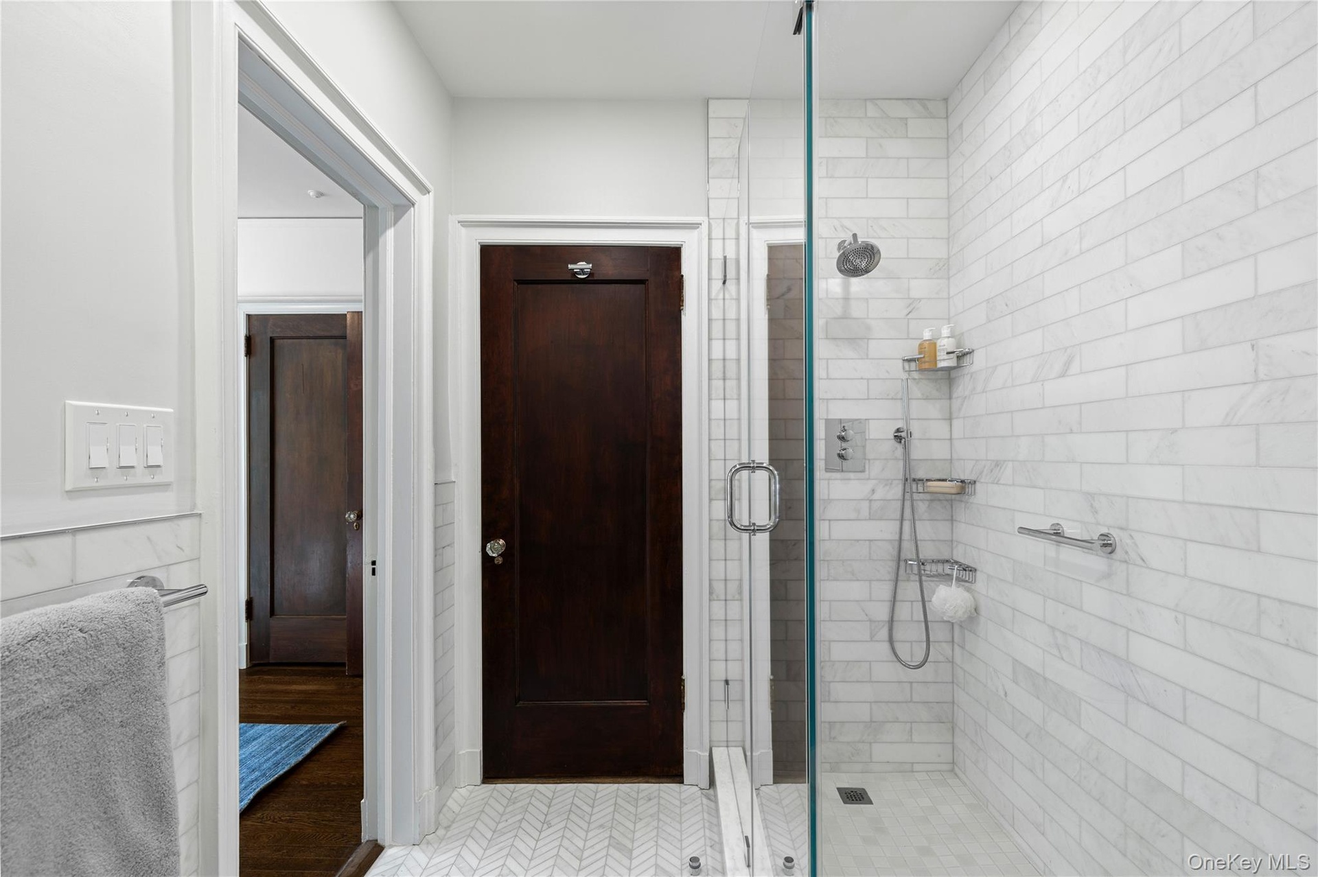 - Full Bathroom #1- Primary Bathroom: View of the primary bathroom with glass enclosed shower and beautiful marble floor.