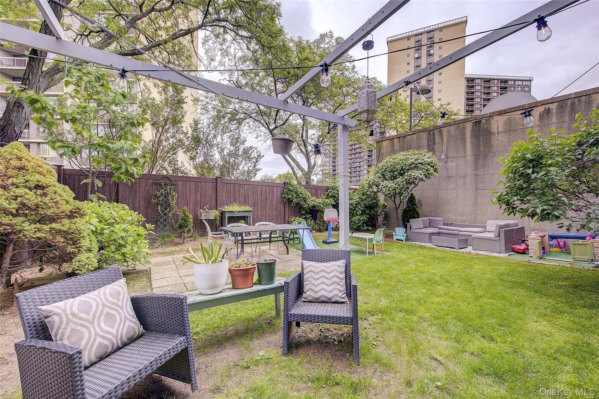 - Fenced backyard featuring a patio, an outdoor living space, and a pergola