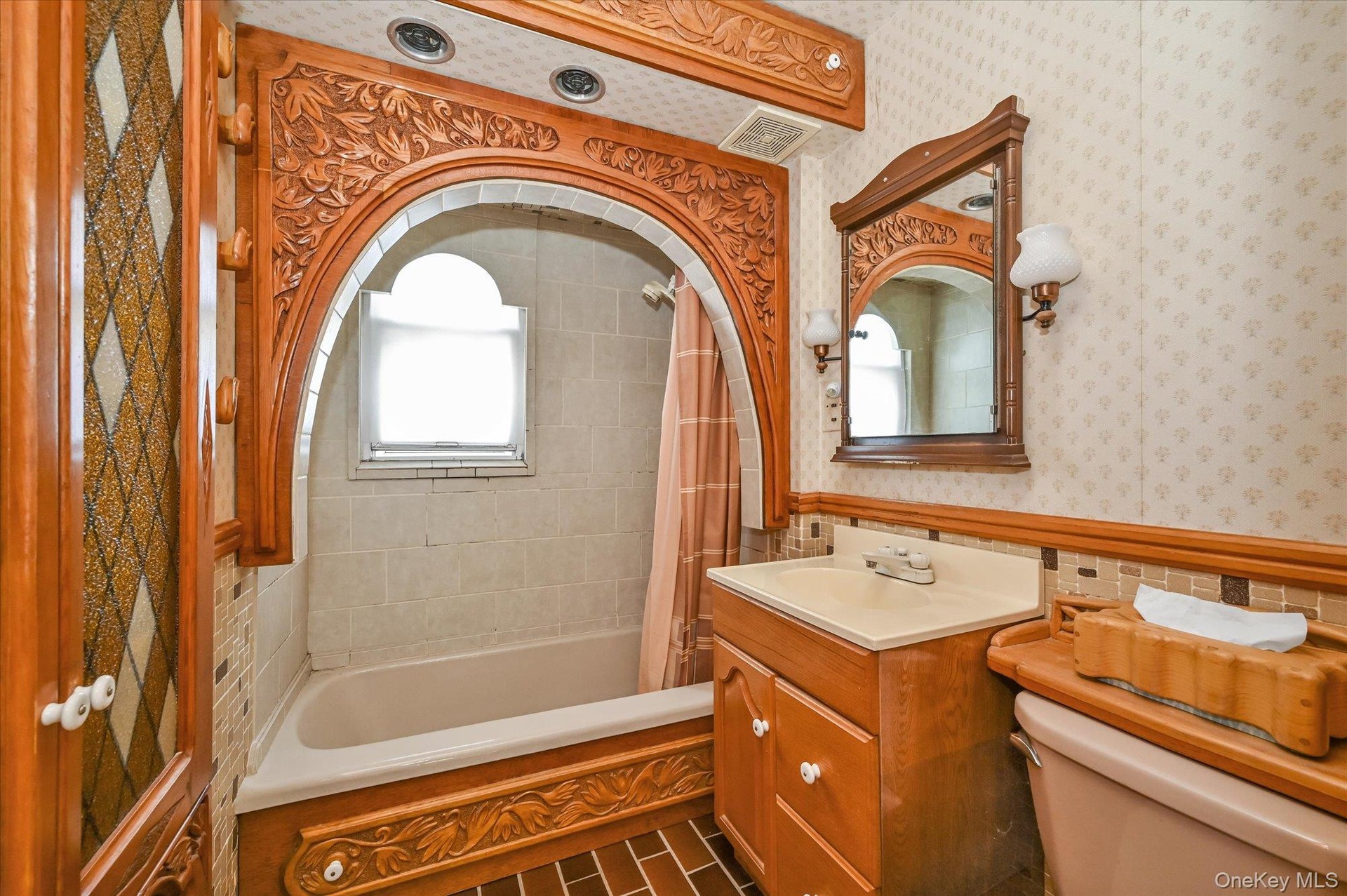 - Bathroom featuring shower / bath combination with curtain, vanity, tile walls, wallpapered walls, and a wainscoted wall