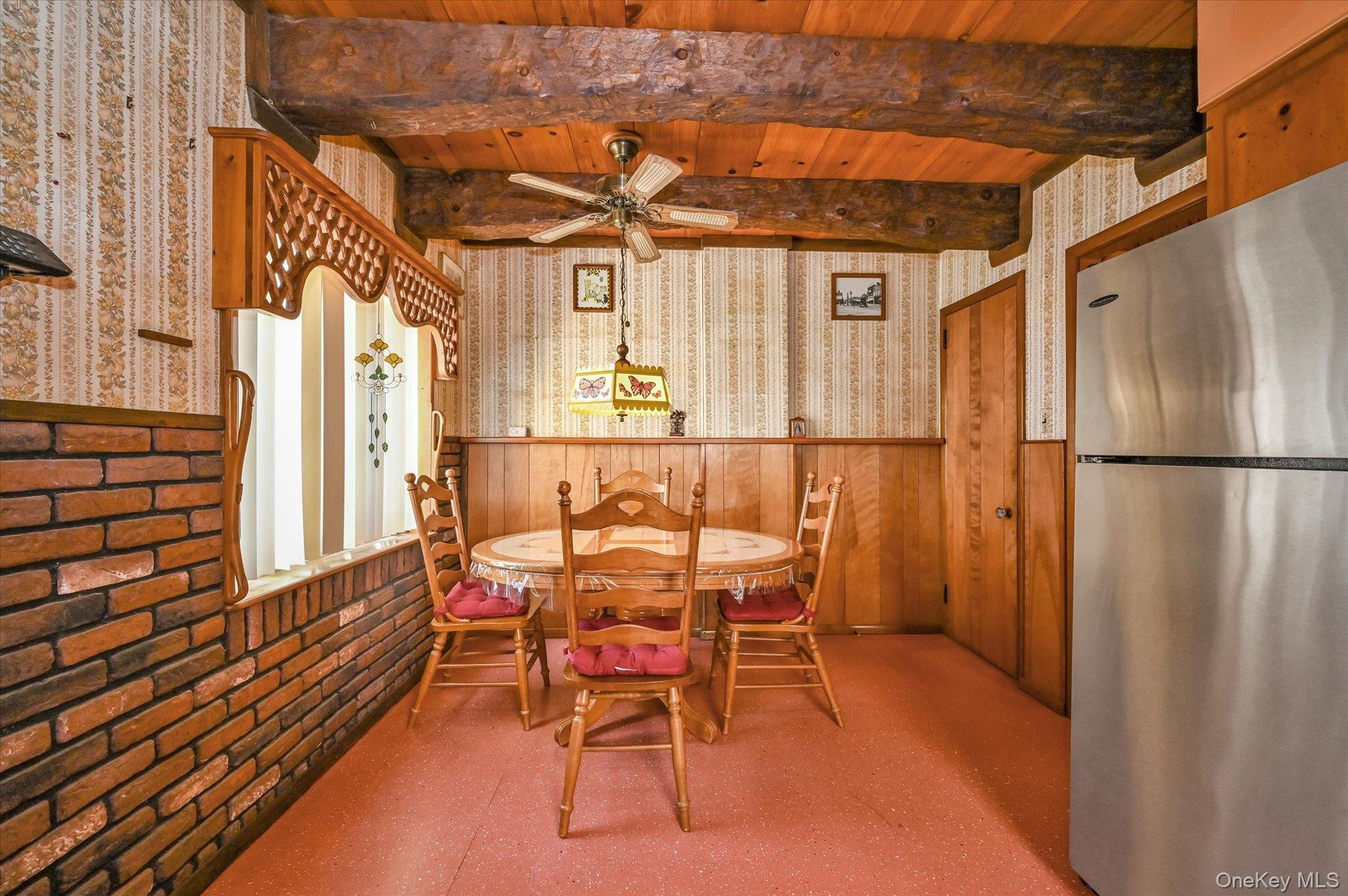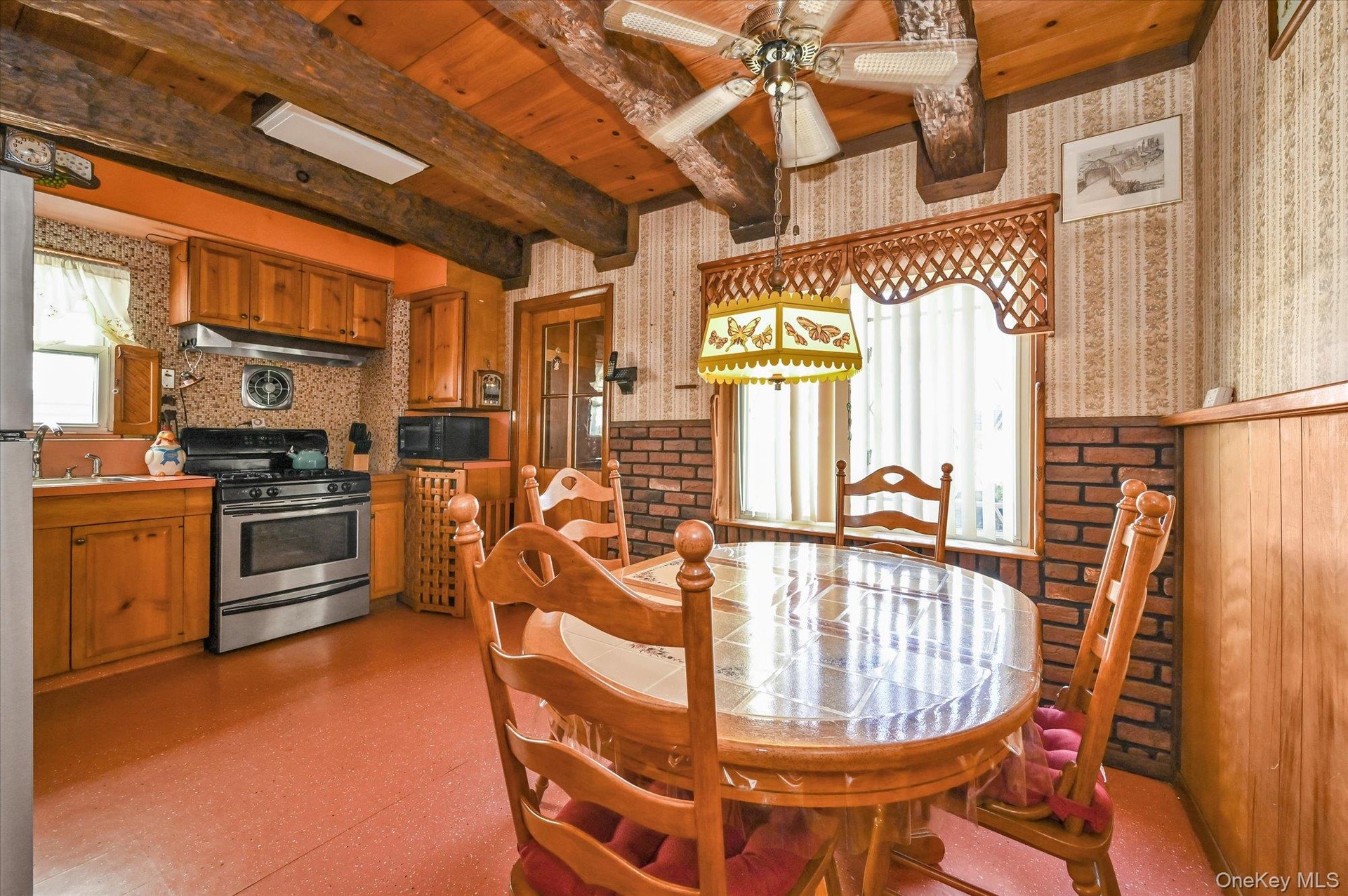 - Dining space with wallpapered walls, a wood ceiling with exposed beams, and ceiling fan