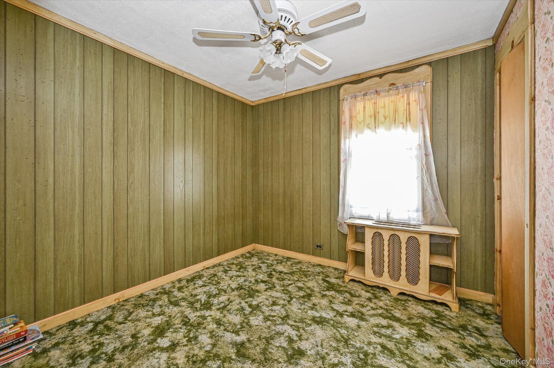 - Spare room with carpet flooring, ornamental molding, ceiling fan, and wooden walls