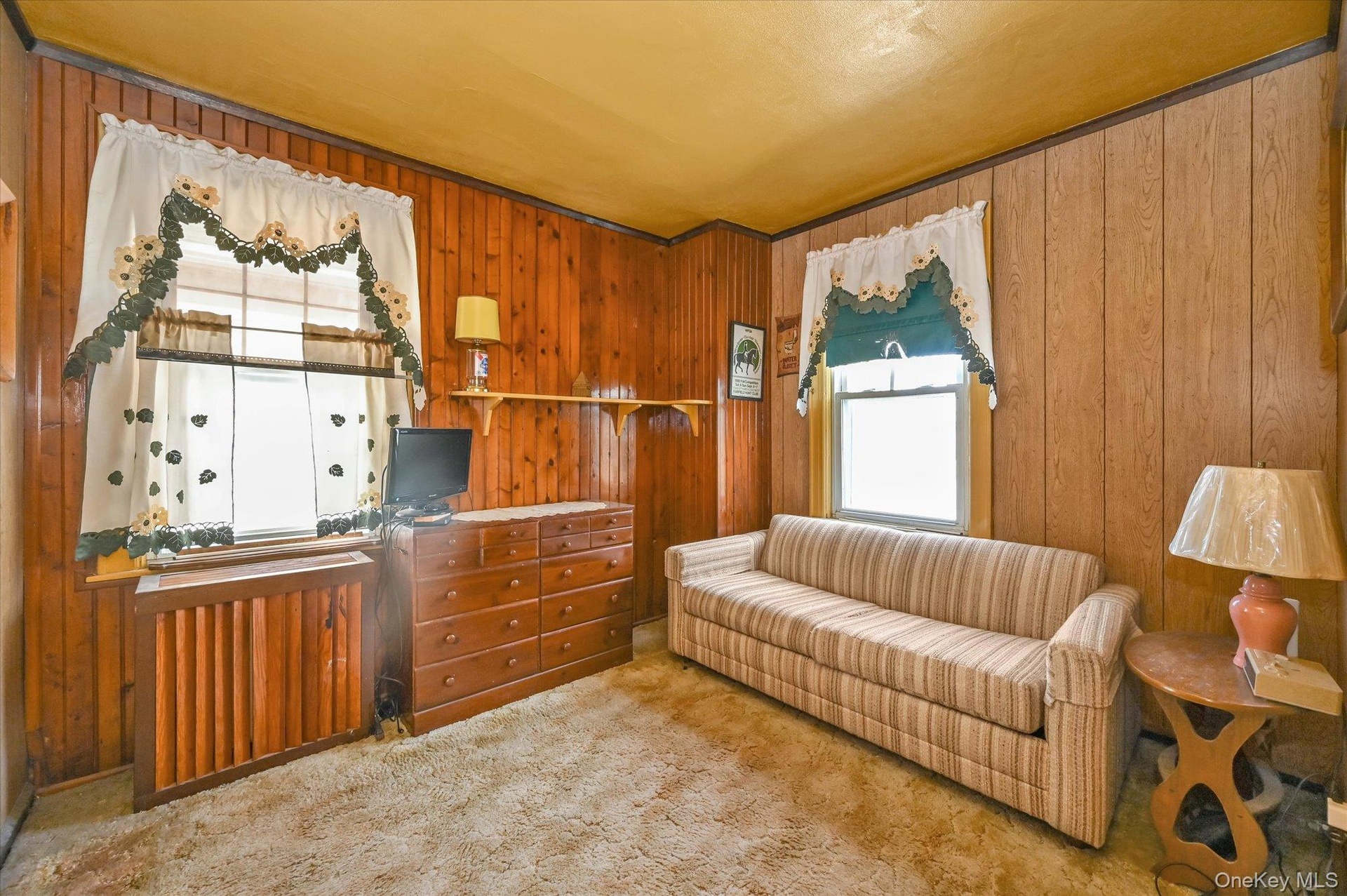 - Living area with wood walls, a wood ceiling with exposed beams, cooling unit, and radiator heating unit